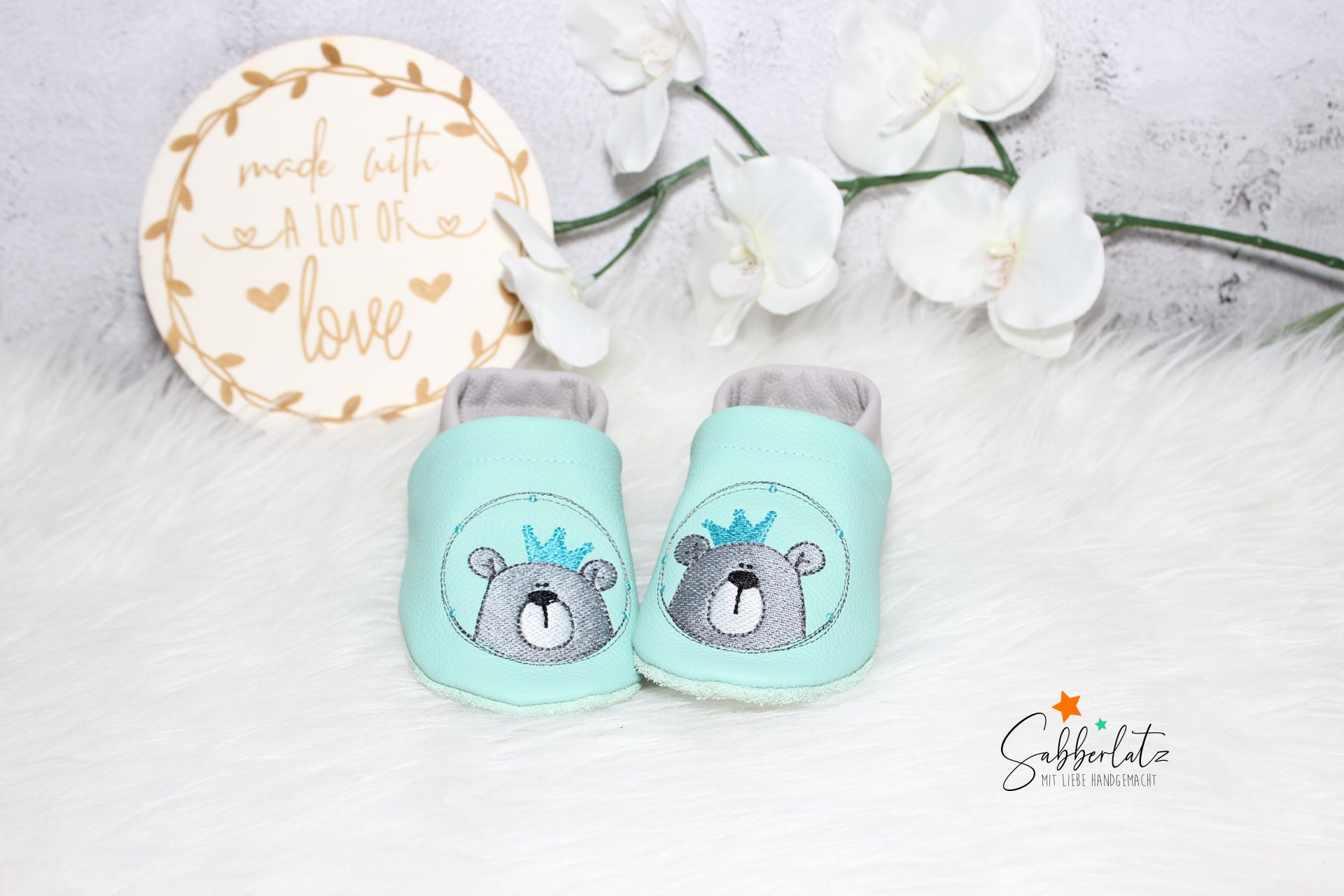 Bitte beachten: Das Gummi in den Puschen lasse ich offen, damit es individuell an den Fuß des Kindes angepasst werden kann. Eine Anleitung zum Verknoten liegt der Bestellung bei.