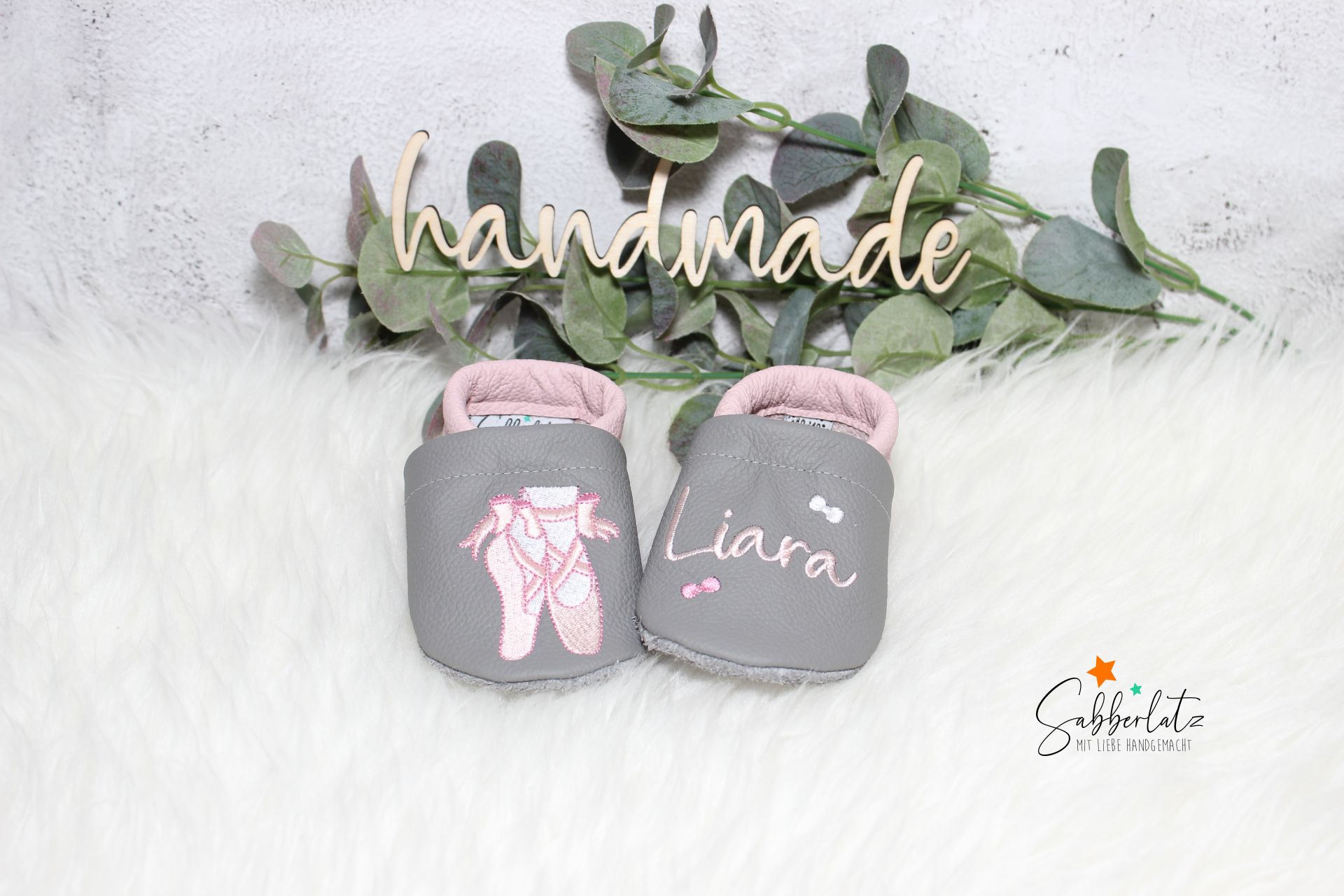 Bitte beachten: Das Gummi in den Puschen lasse ich offen, damit es individuell an den Fuß des Kindes angepasst werden kann. Eine Anleitung zum Verknoten liegt der Bestellung bei.