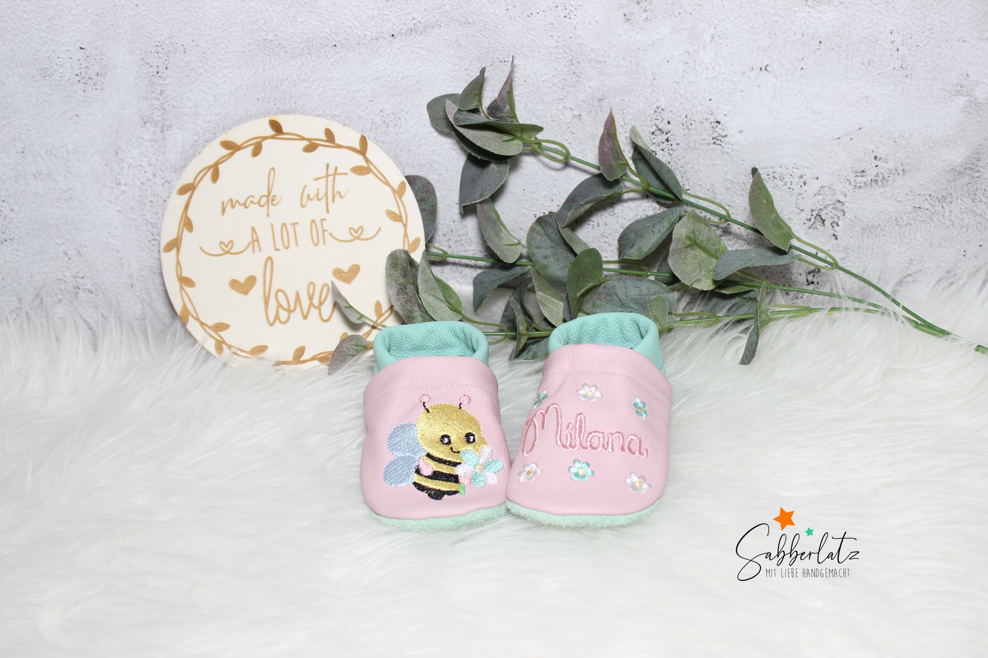 Bitte beachten: Das Gummi in den Puschen lasse ich offen, damit es individuell an den Fuß des Kindes angepasst werden kann. Eine Anleitung zum Verknoten liegt der Bestellung bei.