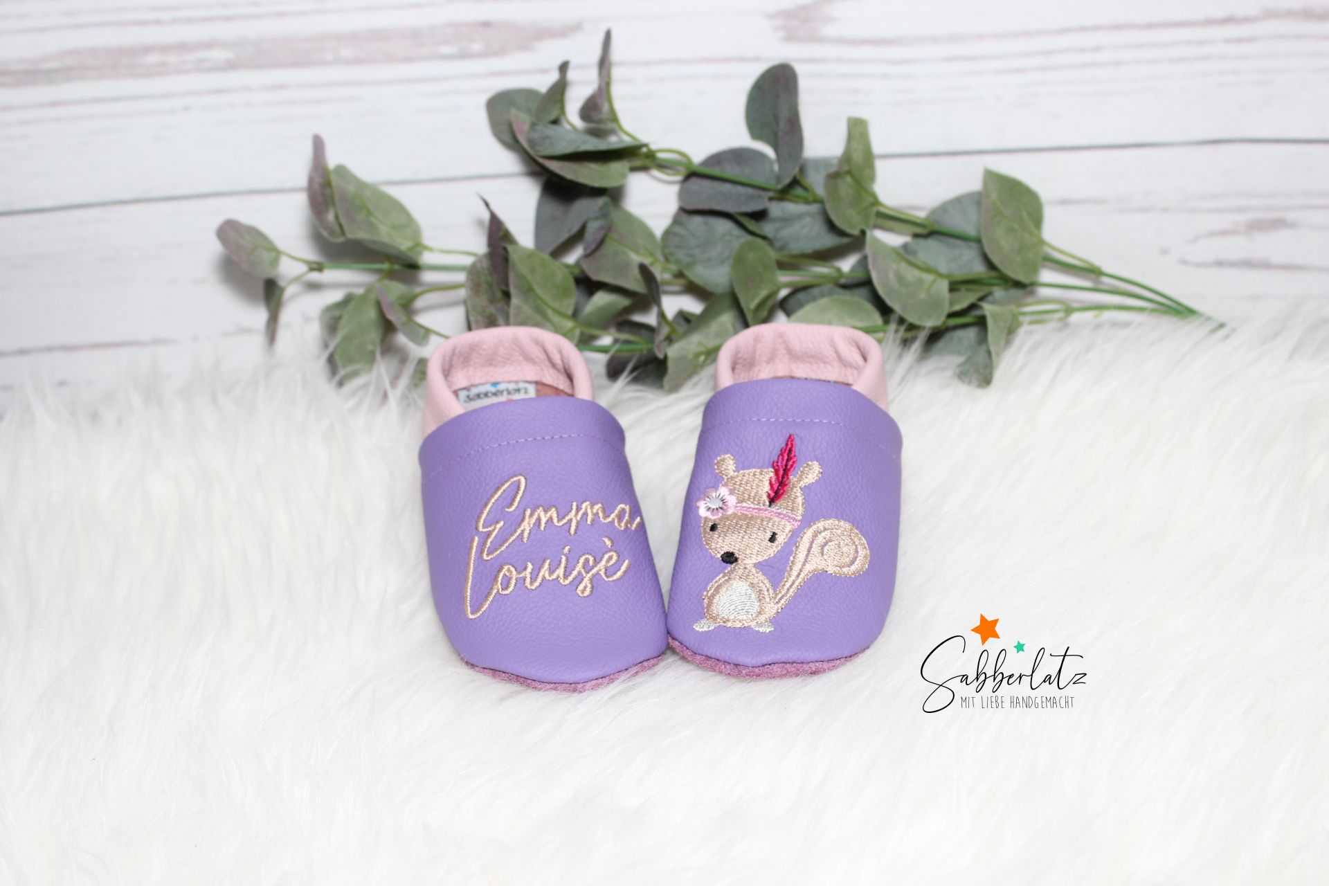 Bitte beachten: Das Gummi in den Puschen lasse ich offen, damit es individuell an den Fuß des Kindes angepasst werden kann. Eine Anleitung zum Verknoten liegt der Bestellung bei.