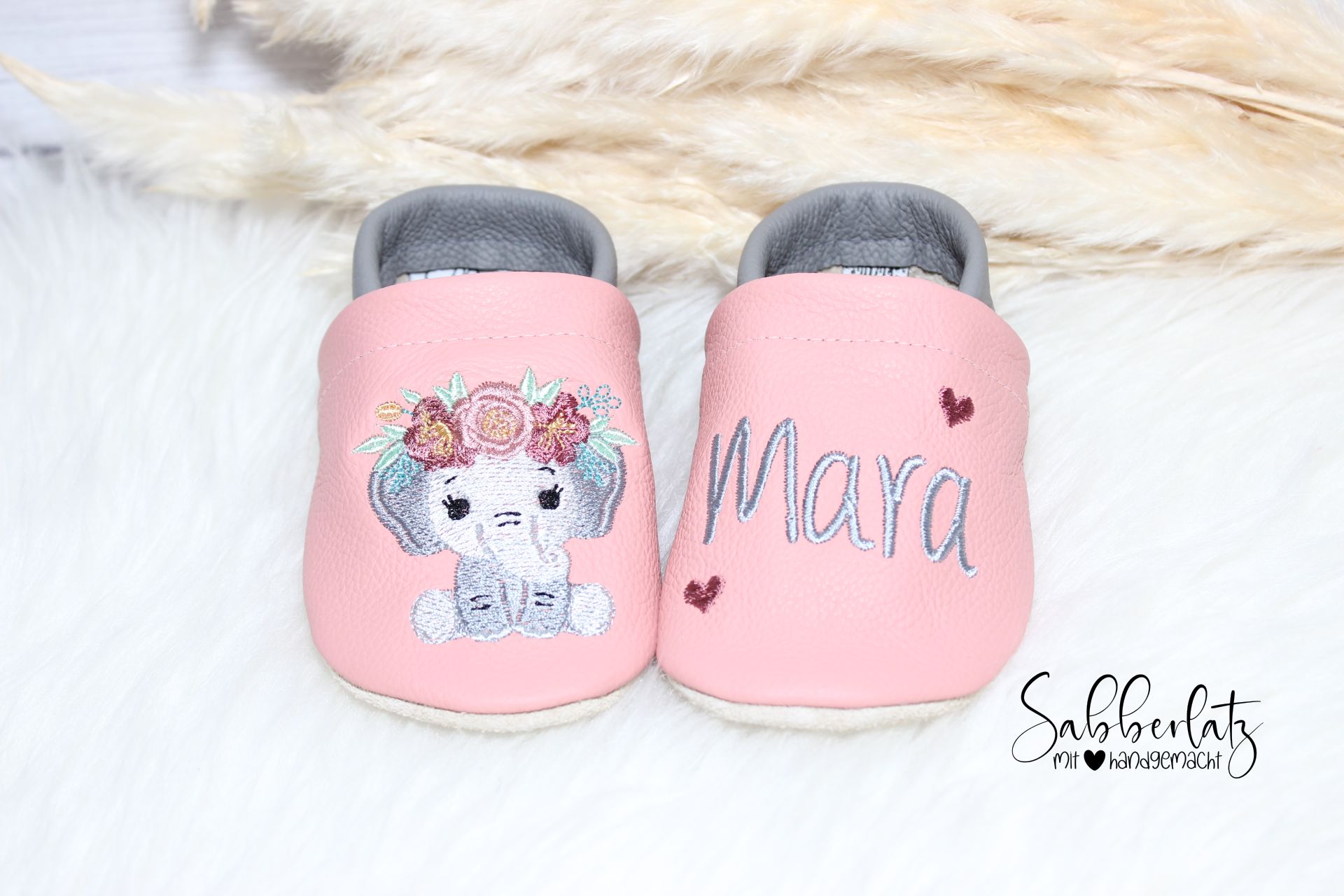 Bitte beachten: Das Gummi in den Puschen lasse ich offen, damit es individuell an den Fuß des Kindes angepasst werden kann. Eine Anleitung zum Verknoten liegt der Bestellung bei.