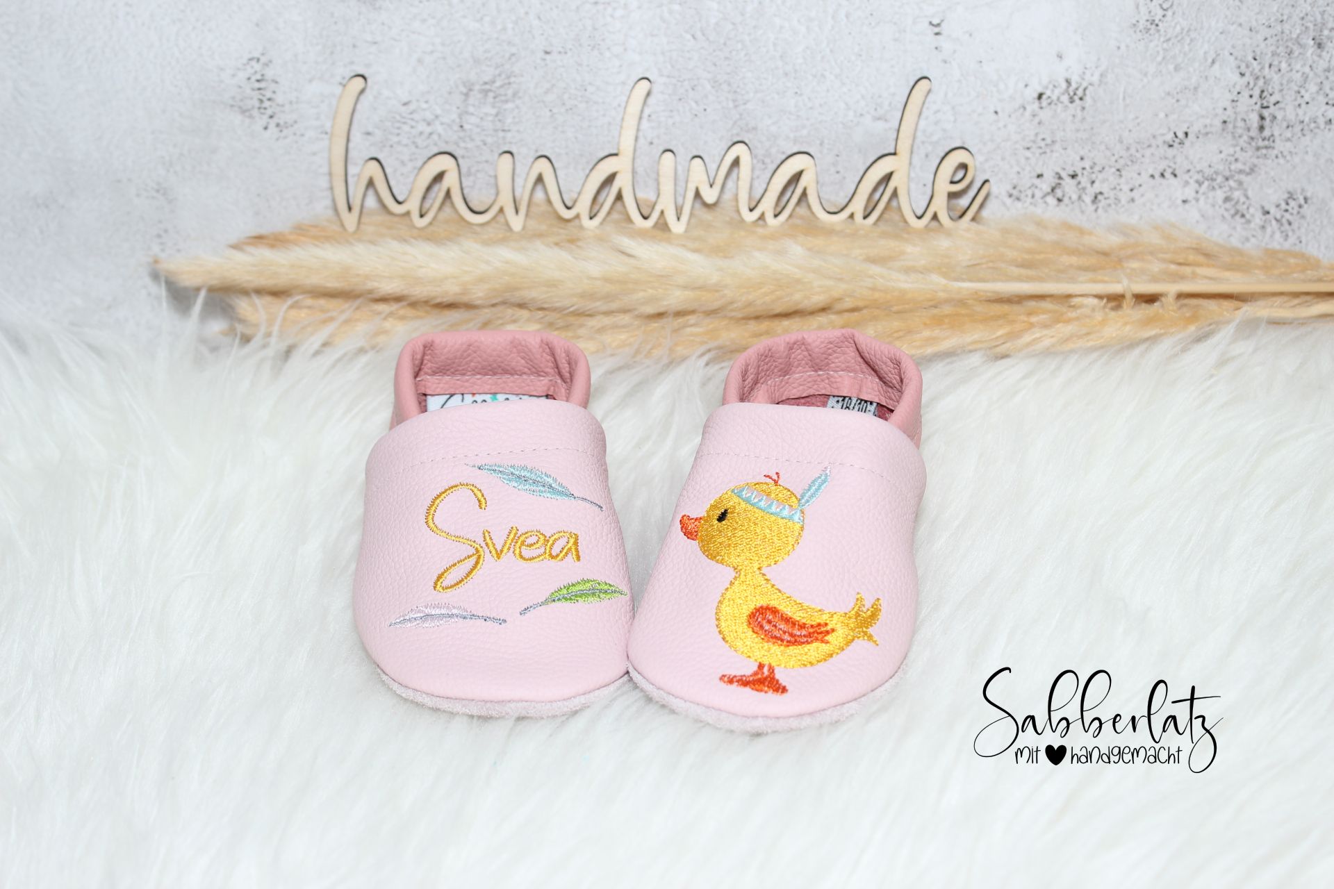 Bitte beachten: Das Gummi in den Puschen lasse ich offen, damit es individuell an den Fuß des Kindes angepasst werden kann. Eine Anleitung zum Verknoten liegt der Bestellung bei.