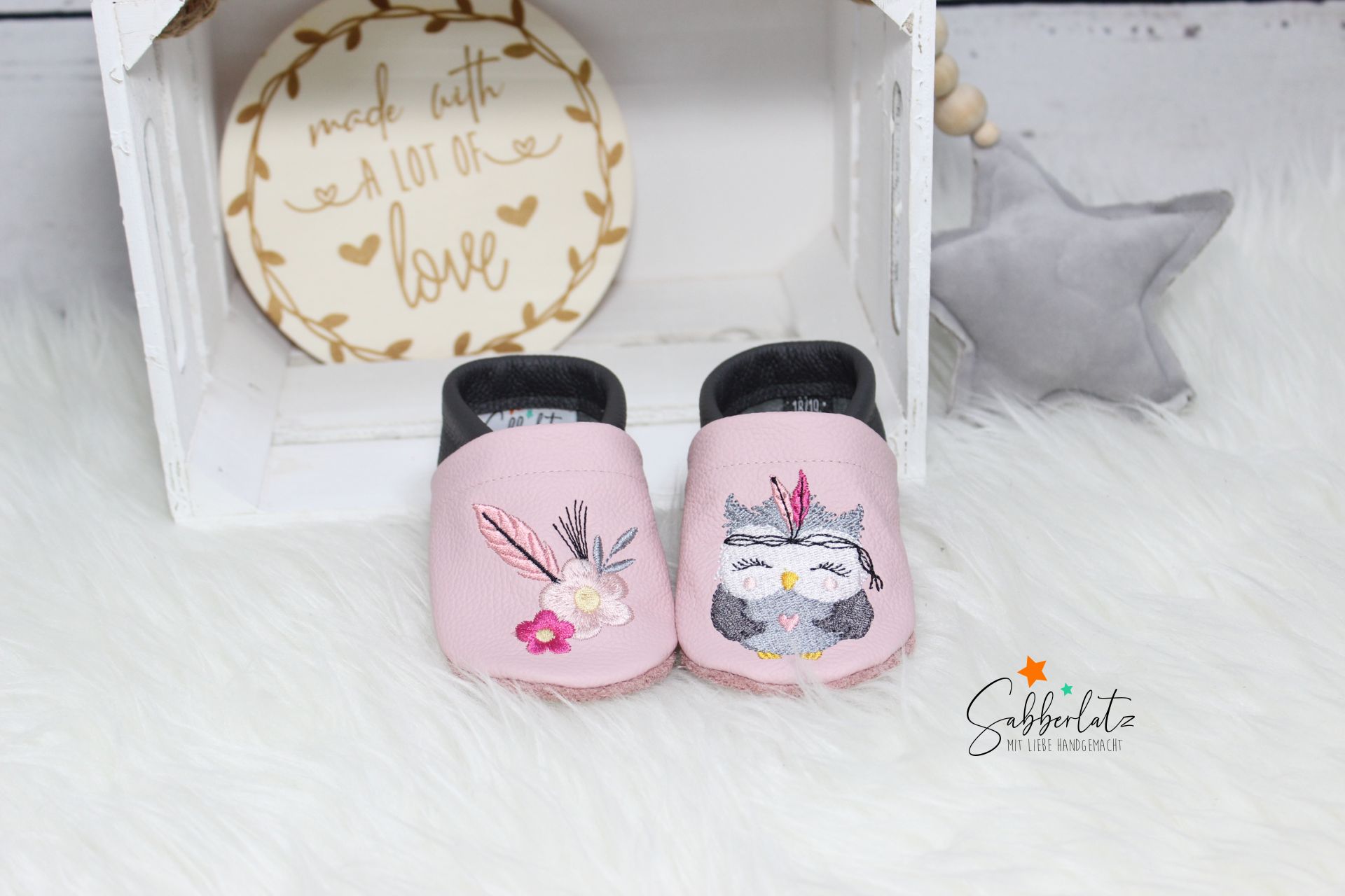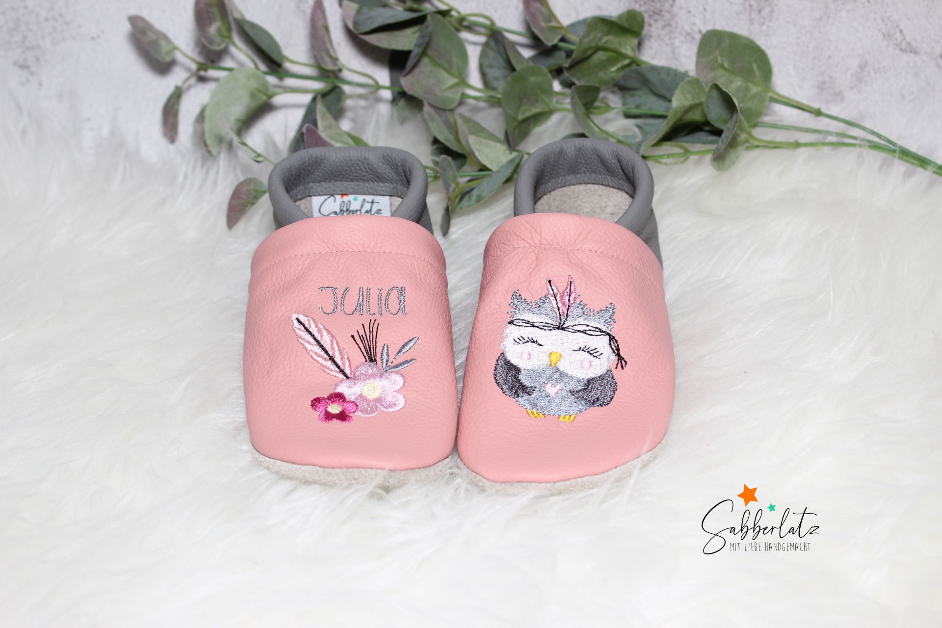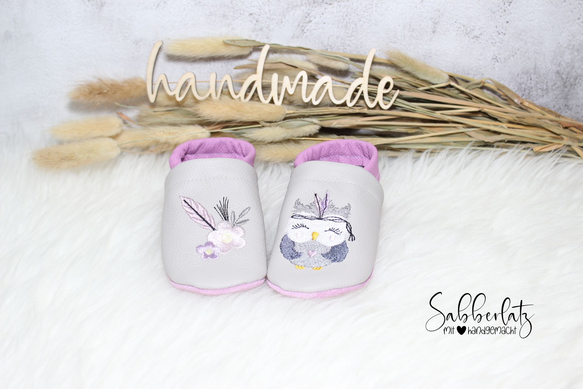 Bitte beachten: Das Gummi in den Puschen lasse ich offen, damit es individuell an den Fuß des Kindes angepasst werden kann. Eine Anleitung zum Verknoten liegt der Bestellung bei.