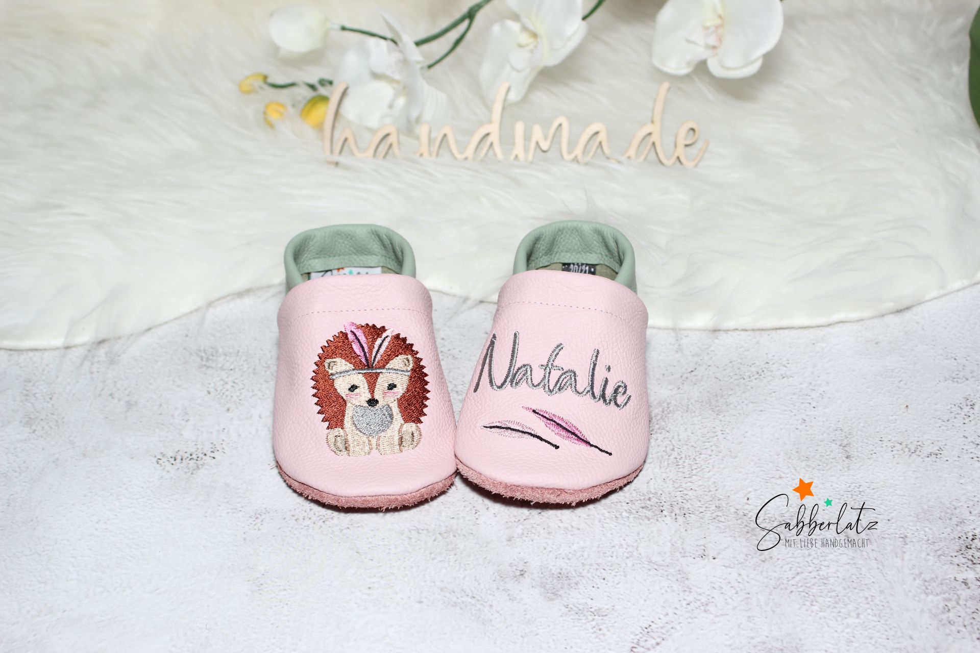 Bitte beachten: Das Gummi in den Puschen lasse ich offen, damit es individuell an den Fuß des Kindes angepasst werden kann. Eine Anleitung zum Verknoten liegt der Bestellung bei.