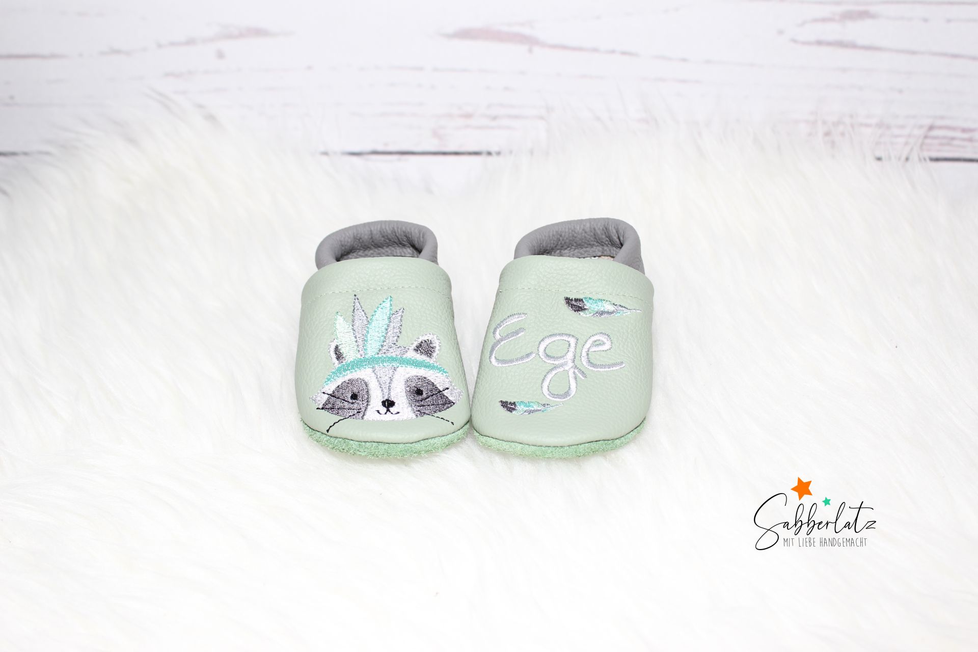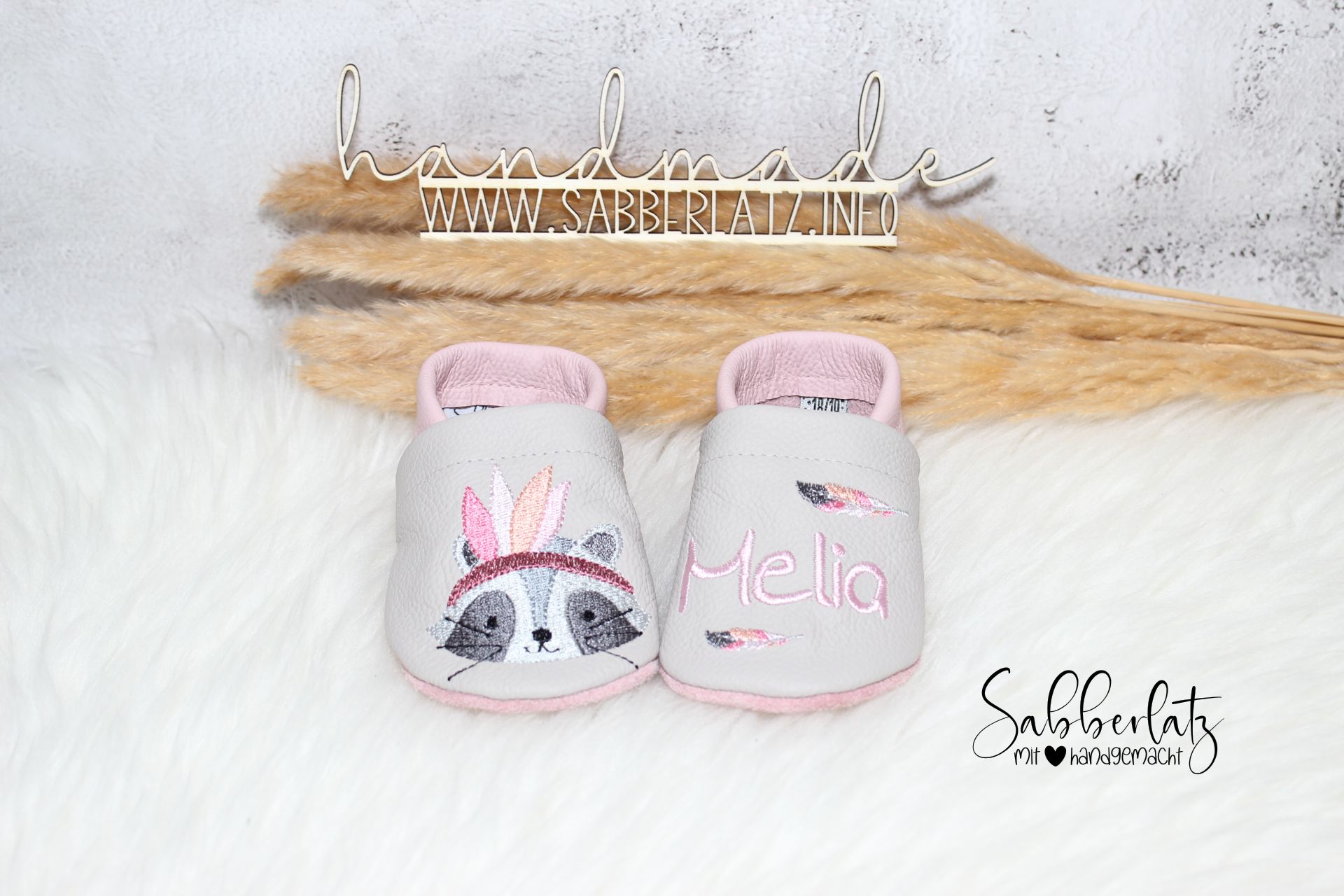 Bitte beachten: Das Gummi in den Puschen lasse ich offen, damit es individuell an den Fuß des Kindes angepasst werden kann. Eine Anleitung zum Verknoten liegt der Bestellung bei.