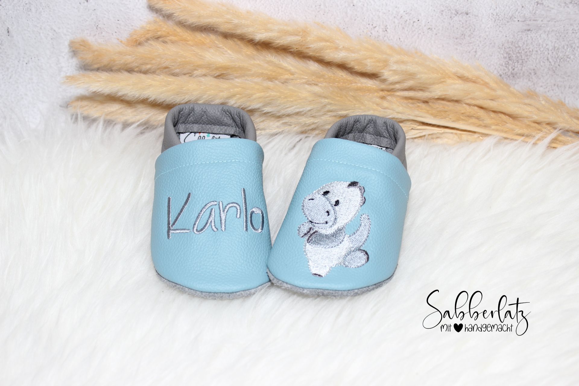 Bitte beachten: Das Gummi in den Puschen lasse ich offen, damit es individuell an den Fuß des Kindes angepasst werden kann. Eine Anleitung zum Verknoten liegt der Bestellung bei.