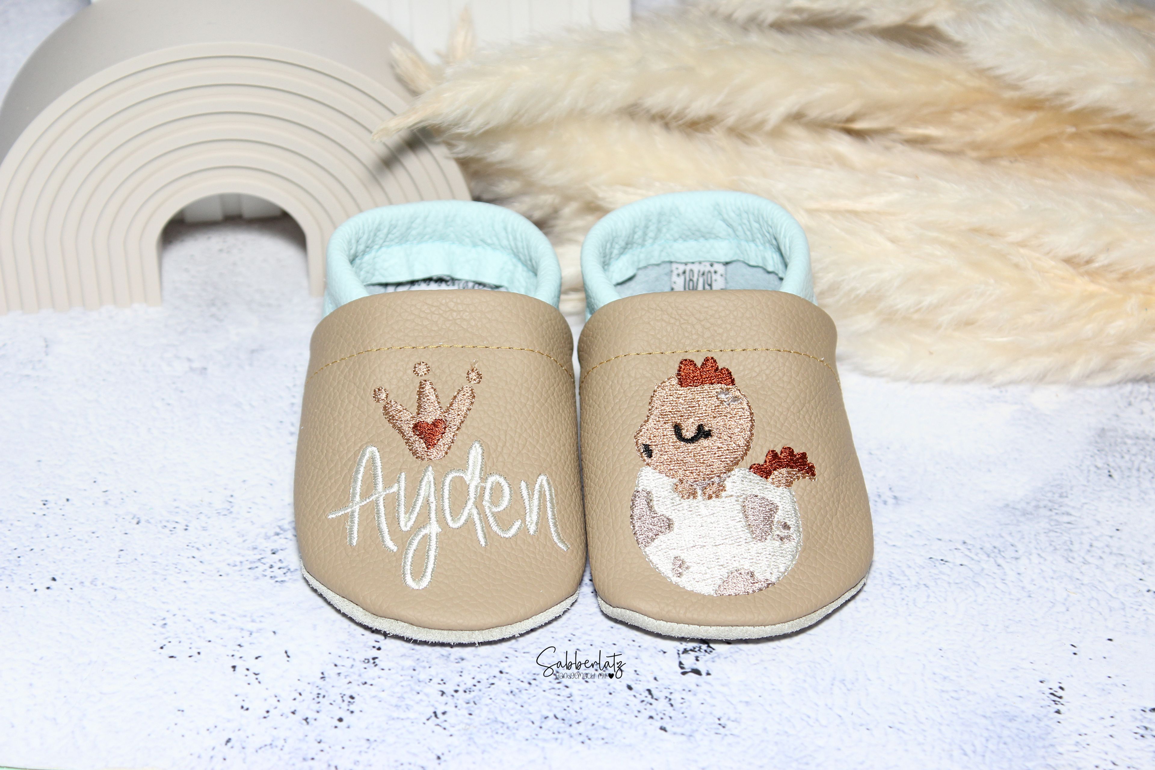 Bitte beachten: Das Gummi in den Puschen lasse ich offen, damit es individuell an den Fuß des Kindes angepasst werden kann. Eine Anleitung zum verknoten liegt der Bestellung bei.
