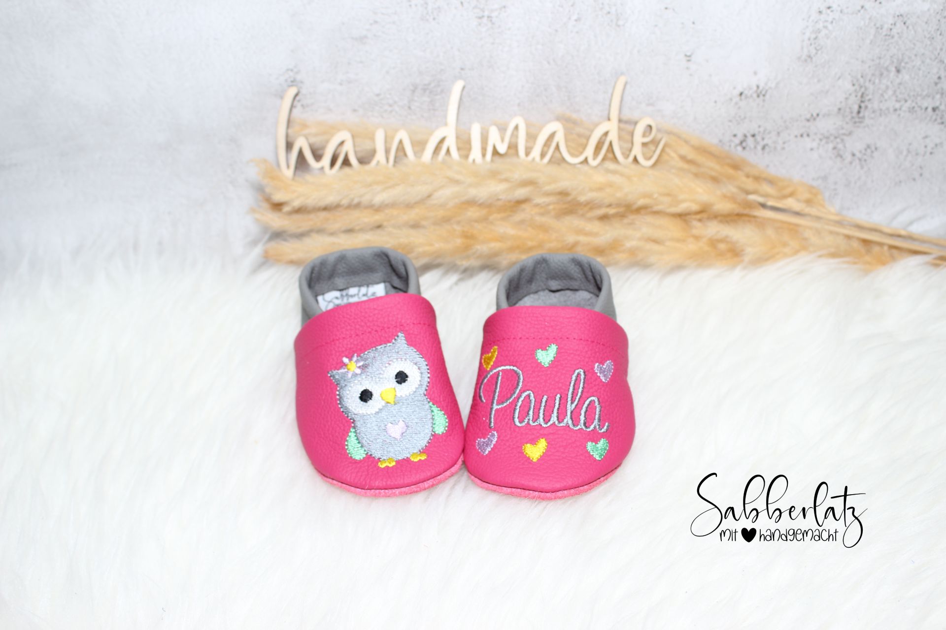 Bitte beachten: Das Gummi in den Puschen lasse ich offen, damit es individuell an den Fuß des Kindes angepasst werden kann. Eine Anleitung zum Verknoten liegt der Bestellung bei.