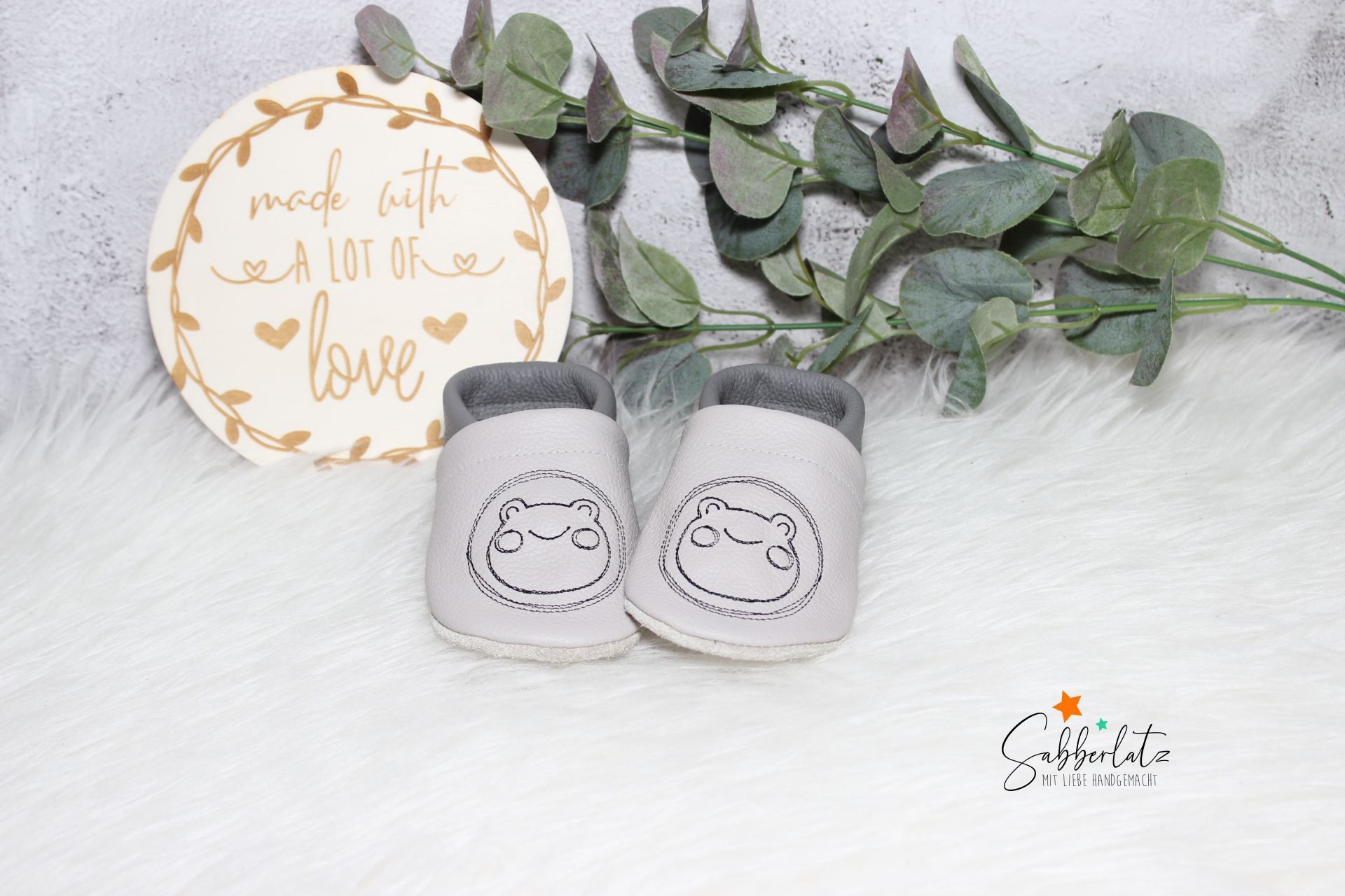 Bitte beachten: Das Gummi in den Puschen lasse ich offen, damit Sie es individuell an den Fuß des Kindes anpassen können. Eine Anleitung zum verknoten liegt der Bestellung bei.