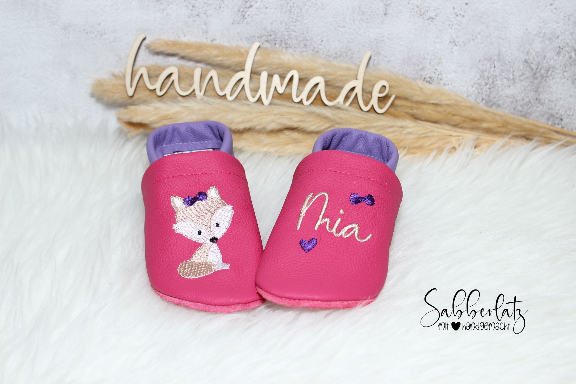 Bitte beachten: Das Gummi in den Puschen lasse ich offen, damit es individuell an den Fuß des Kindes angepasst werden kann. Eine Anleitung zum Verknoten liegt der Bestellung bei.