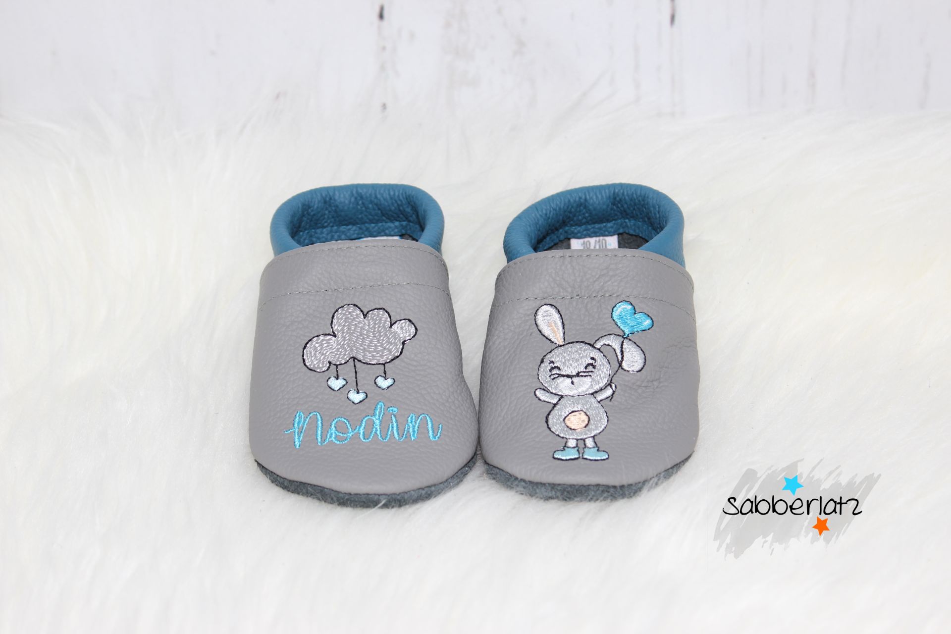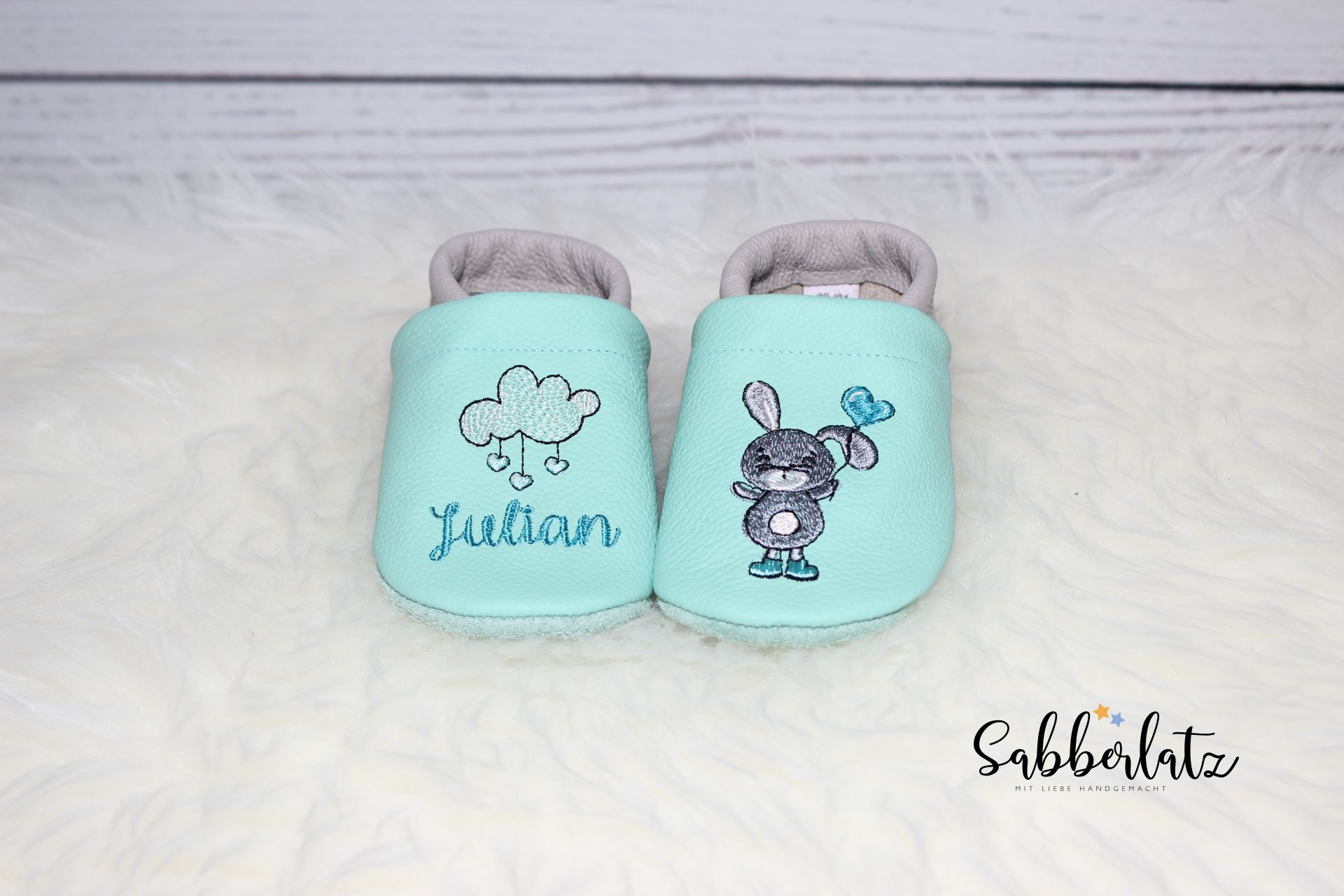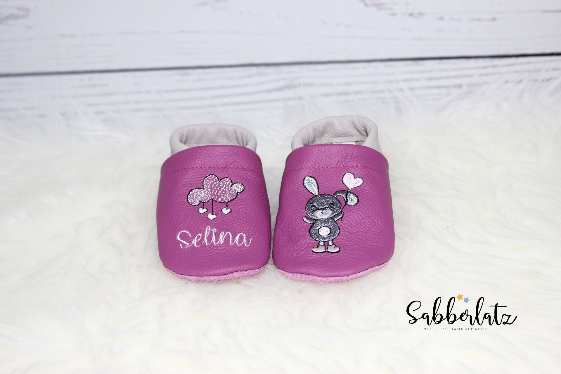 Bitte beachten: Das Gummi in den Puschen lasse ich offen, damit es individuell an den Fuß des Kindes angepasst werden kann. Eine Anleitung zum Verknoten liegt der Bestellung bei.