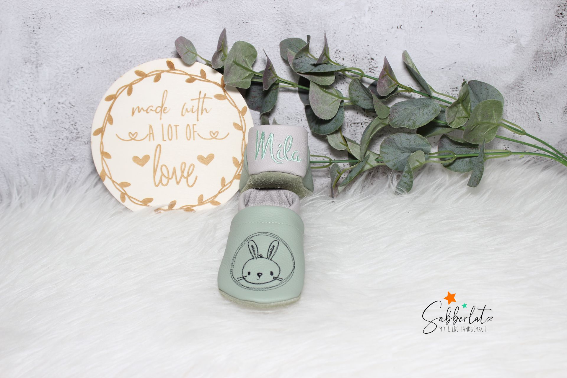 Bitte beachten: Das Gummi in den Puschen lasse ich offen, damit Sie es individuell an den Fuß des Kindes anpassen können. Eine Anleitung zum verknoten liegt der Bestellung bei.