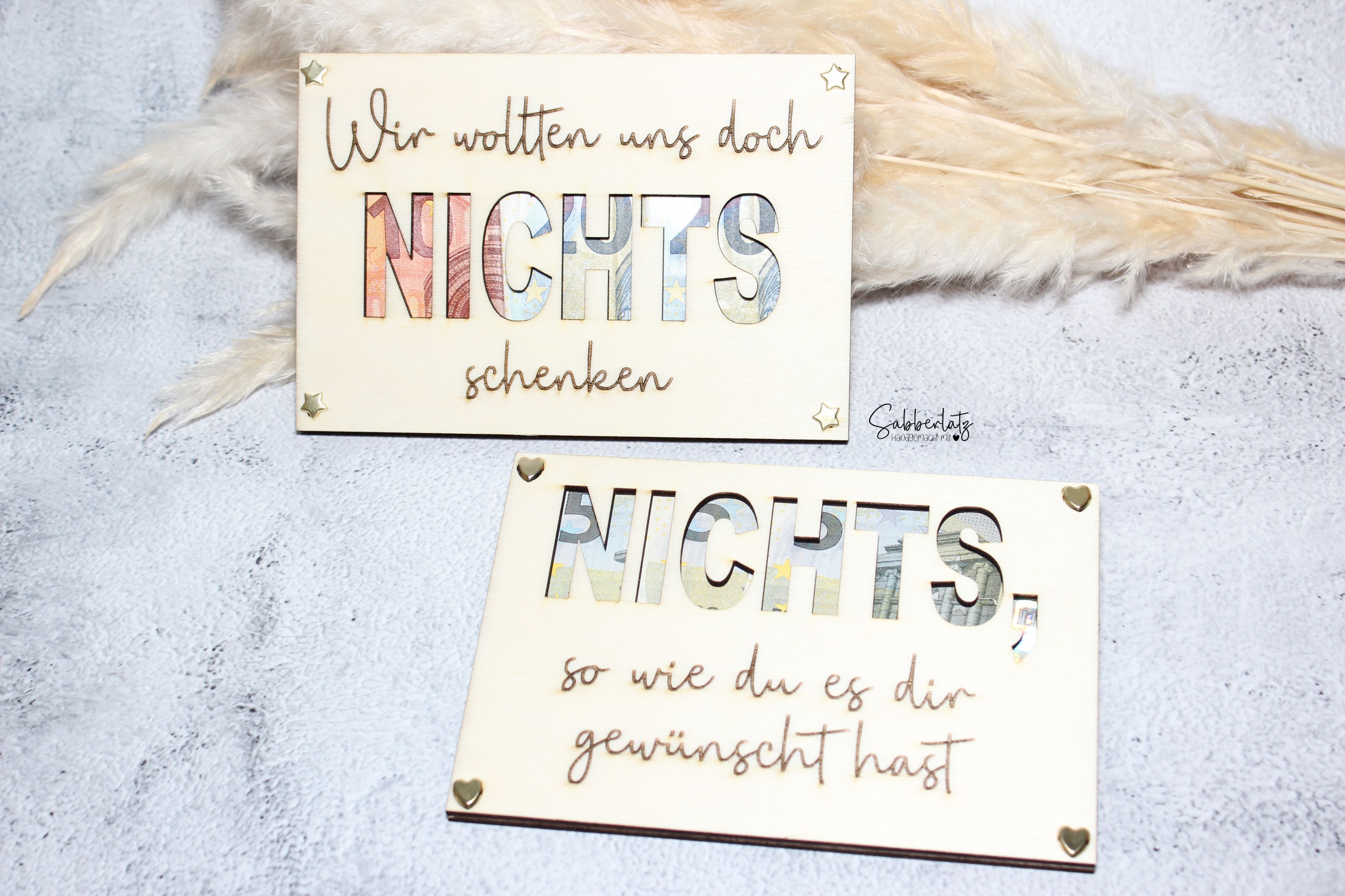 Du kannst zwischen mehreren Modellen auswählen, oder auch deinen eigenen Wunschtext angeben, bitte schreibe dann das Wort welches ausgeschnitten werden soll in Großbuchstaben! Beispiel: Wir wollten uns doch NICHTS schenken.