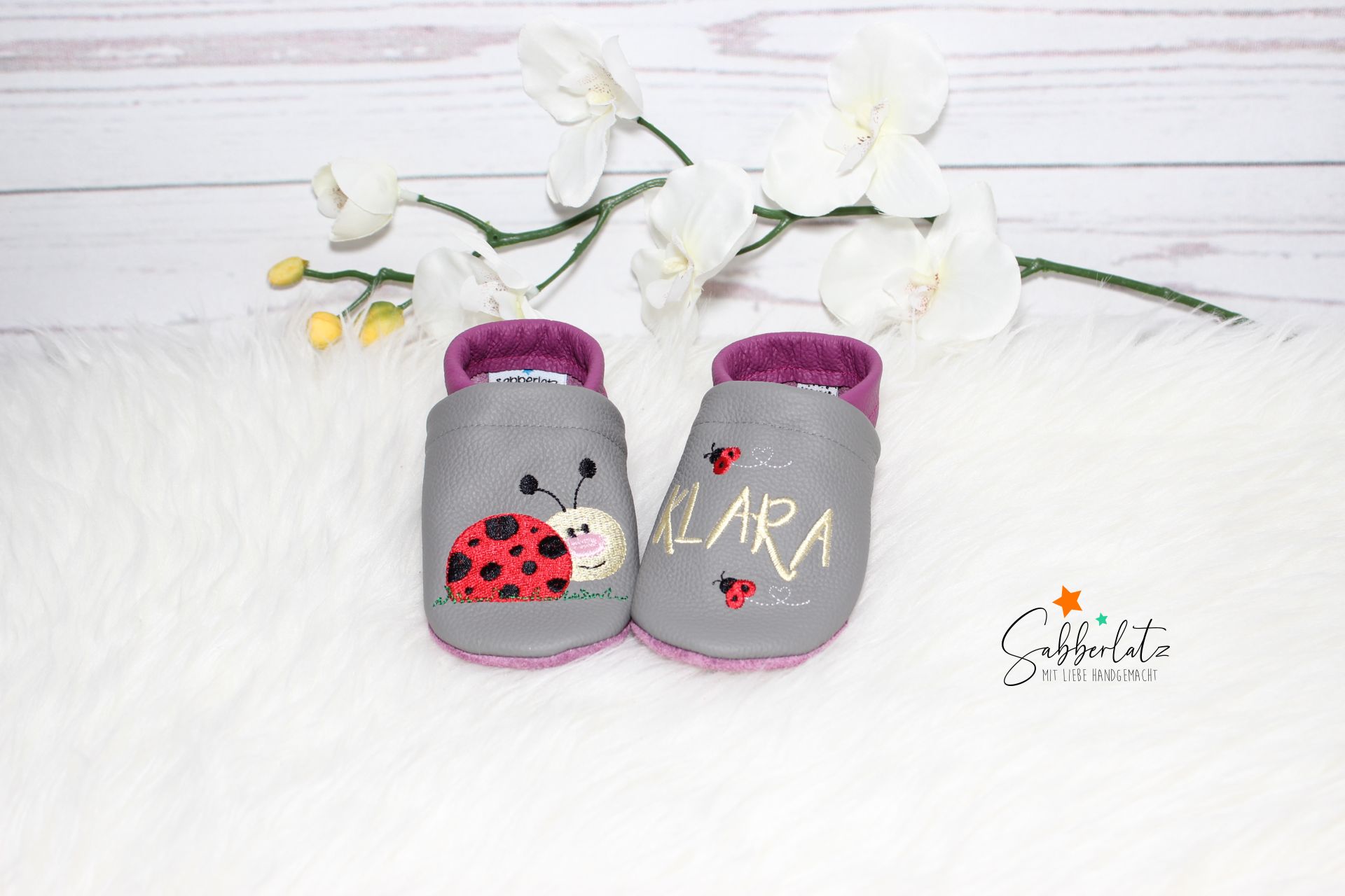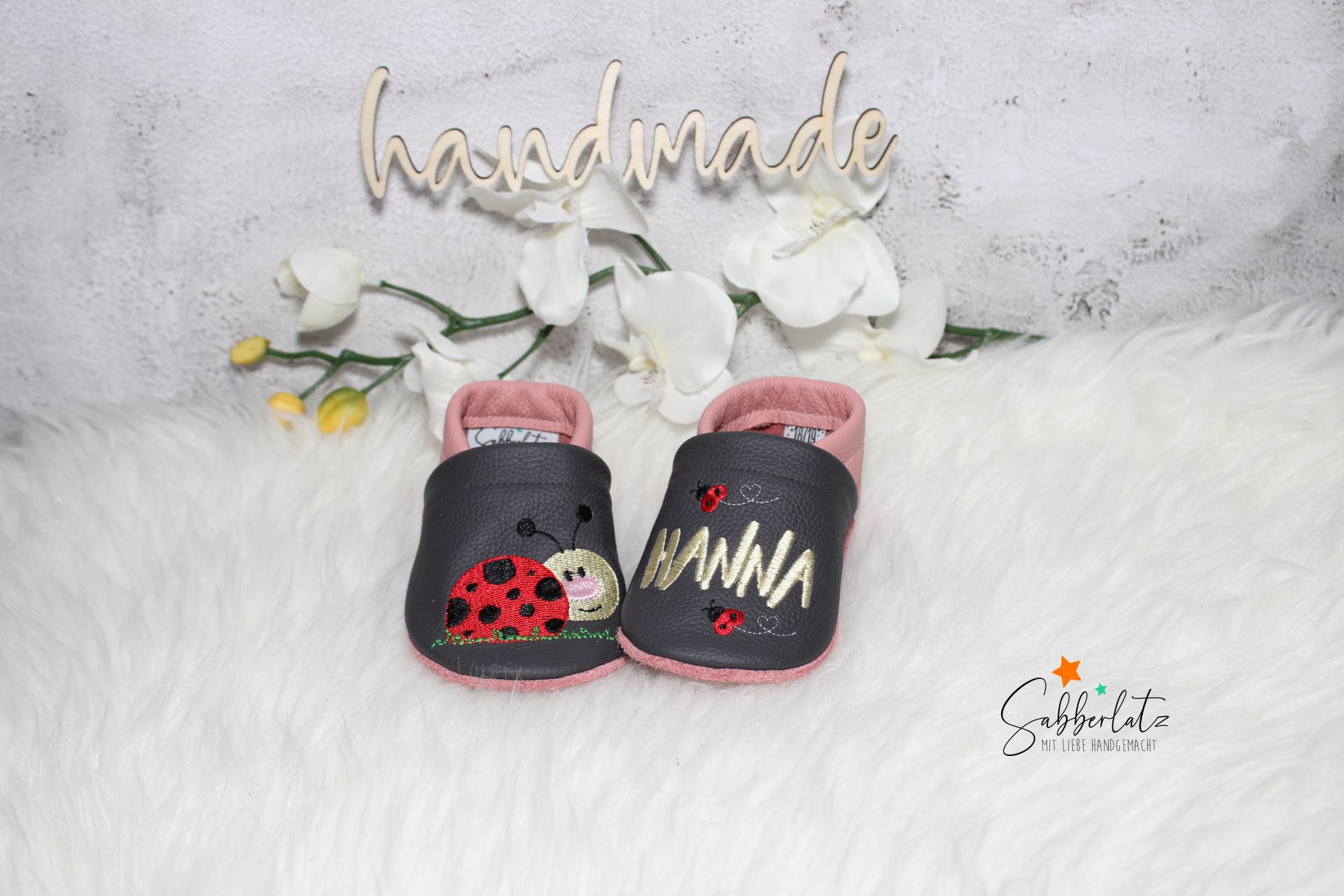 Bitte beachten: Das Gummi in den Puschen lasse ich offen, damit es individuell an den Fuß des Kindes angepasst werden kann. Eine Anleitung zum Verknoten liegt der Bestellung bei.