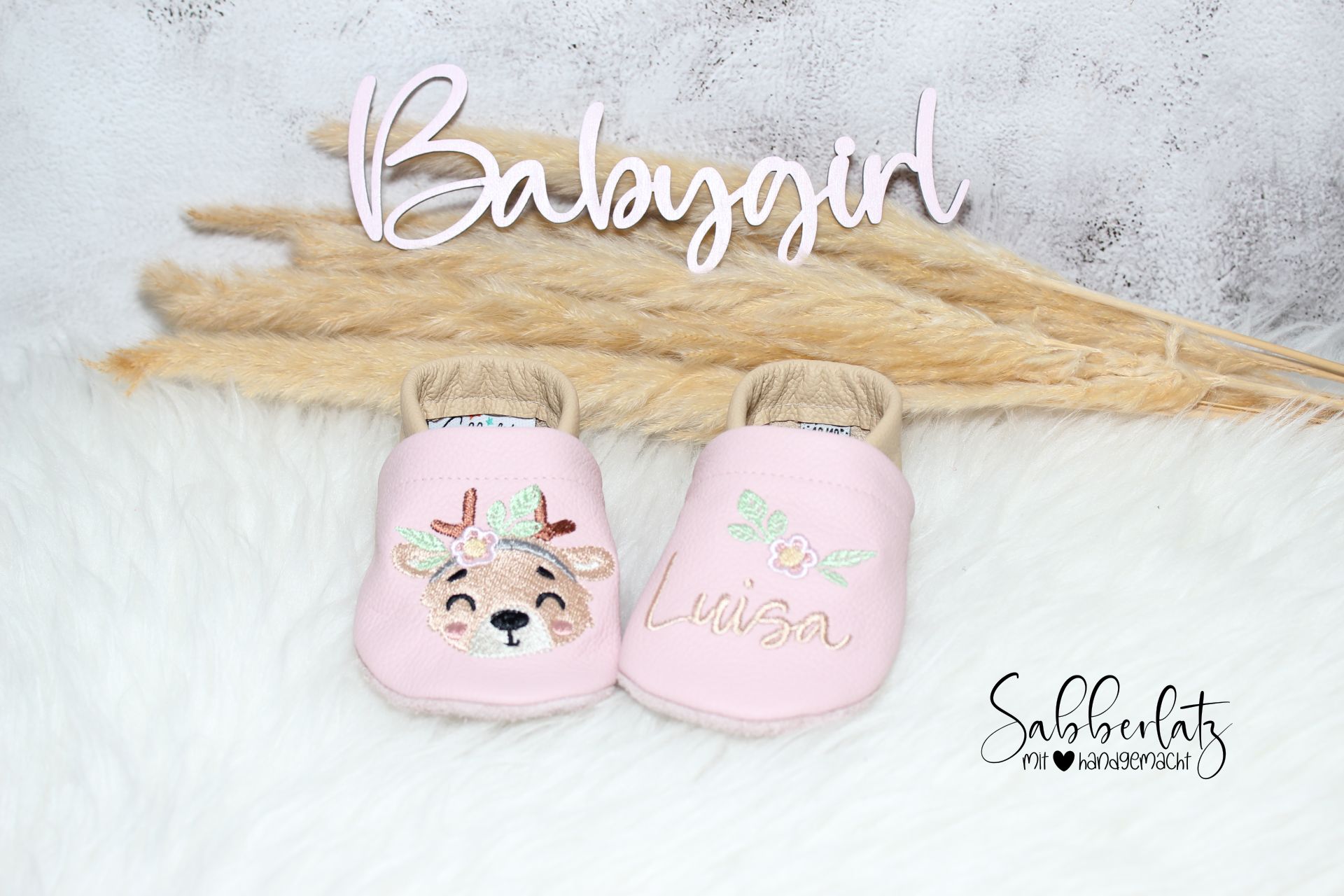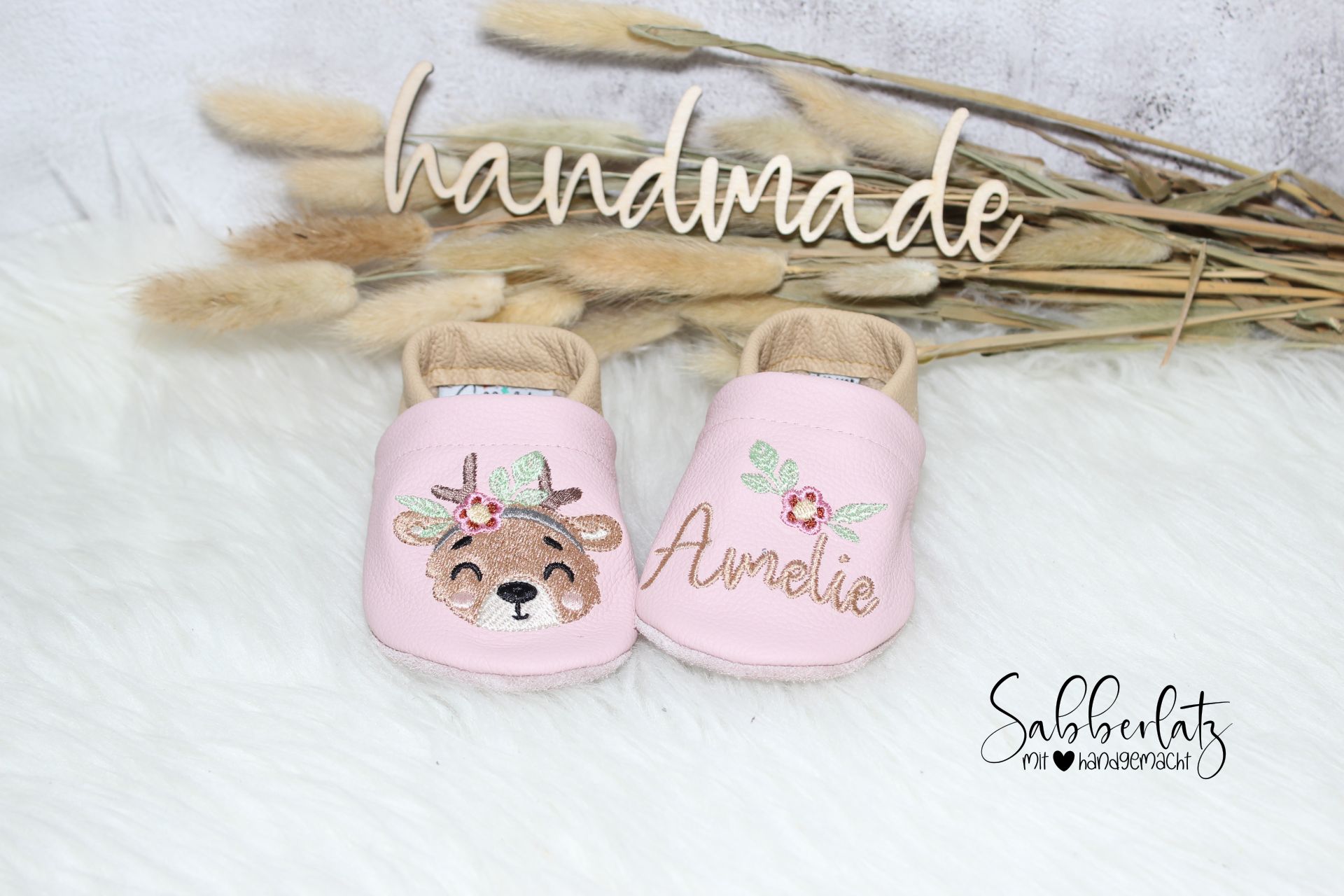 Bitte beachten: Das Gummi in den Puschen lasse ich offen, damit es individuell an den Fuß des Kindes angepasst werden kann. Eine Anleitung zum Verknoten liegt der Bestellung bei.