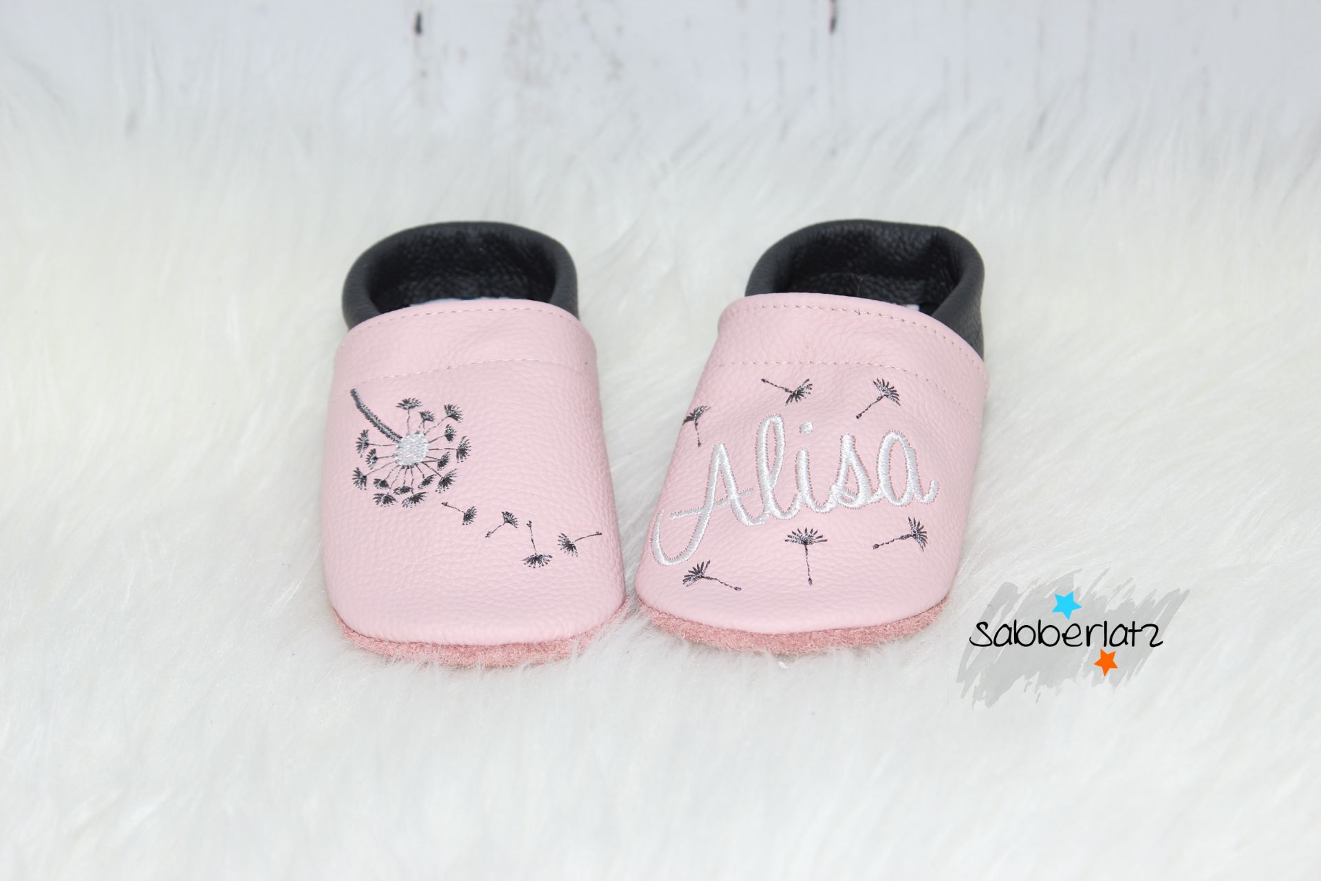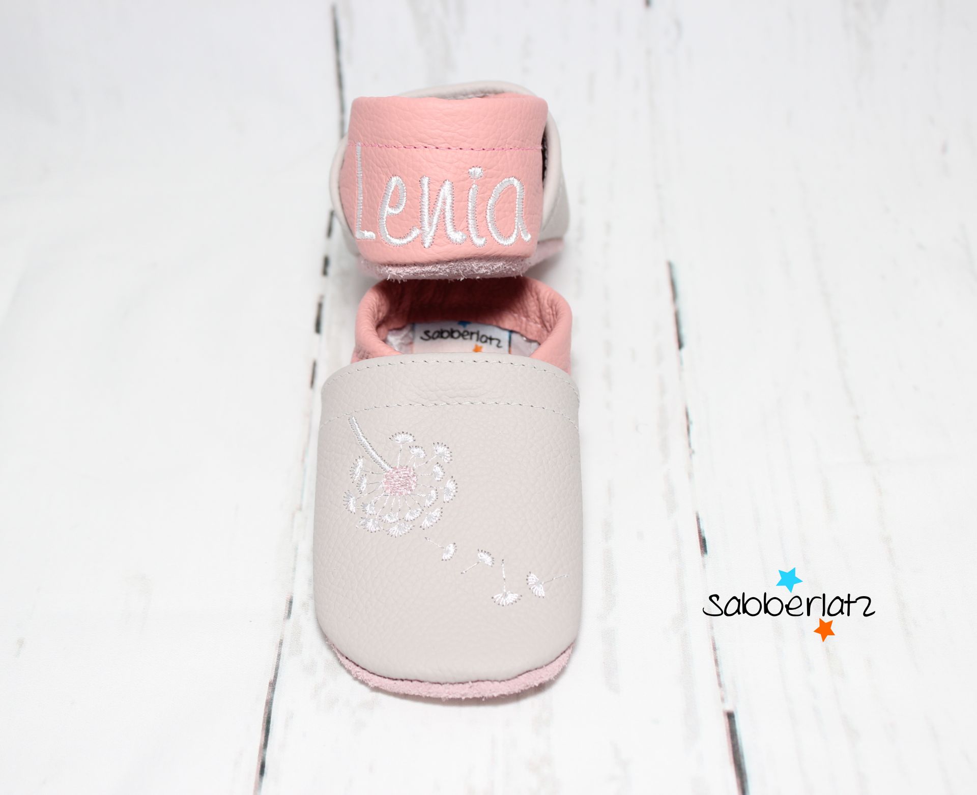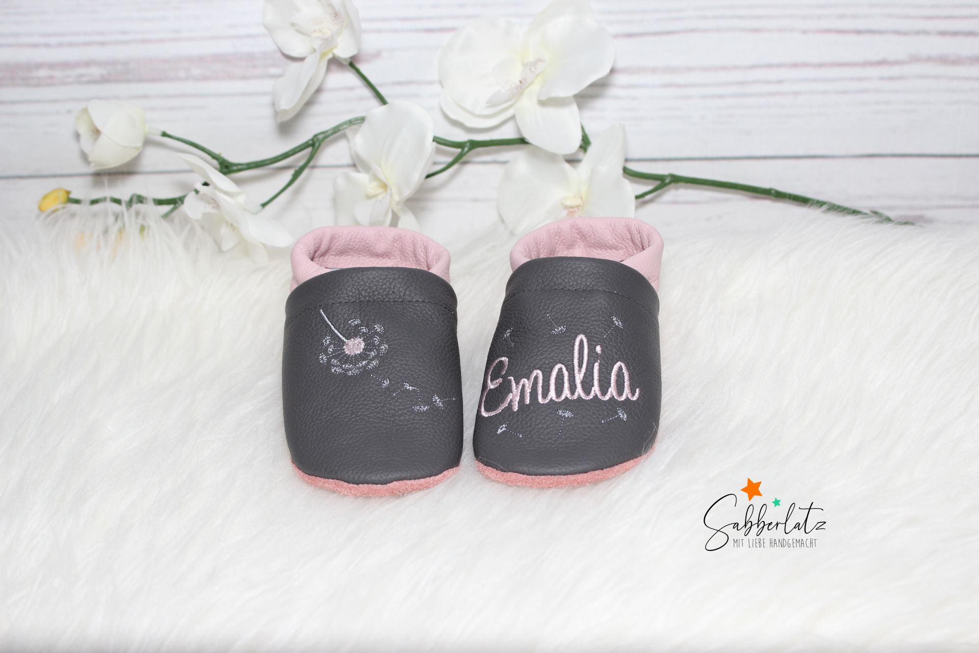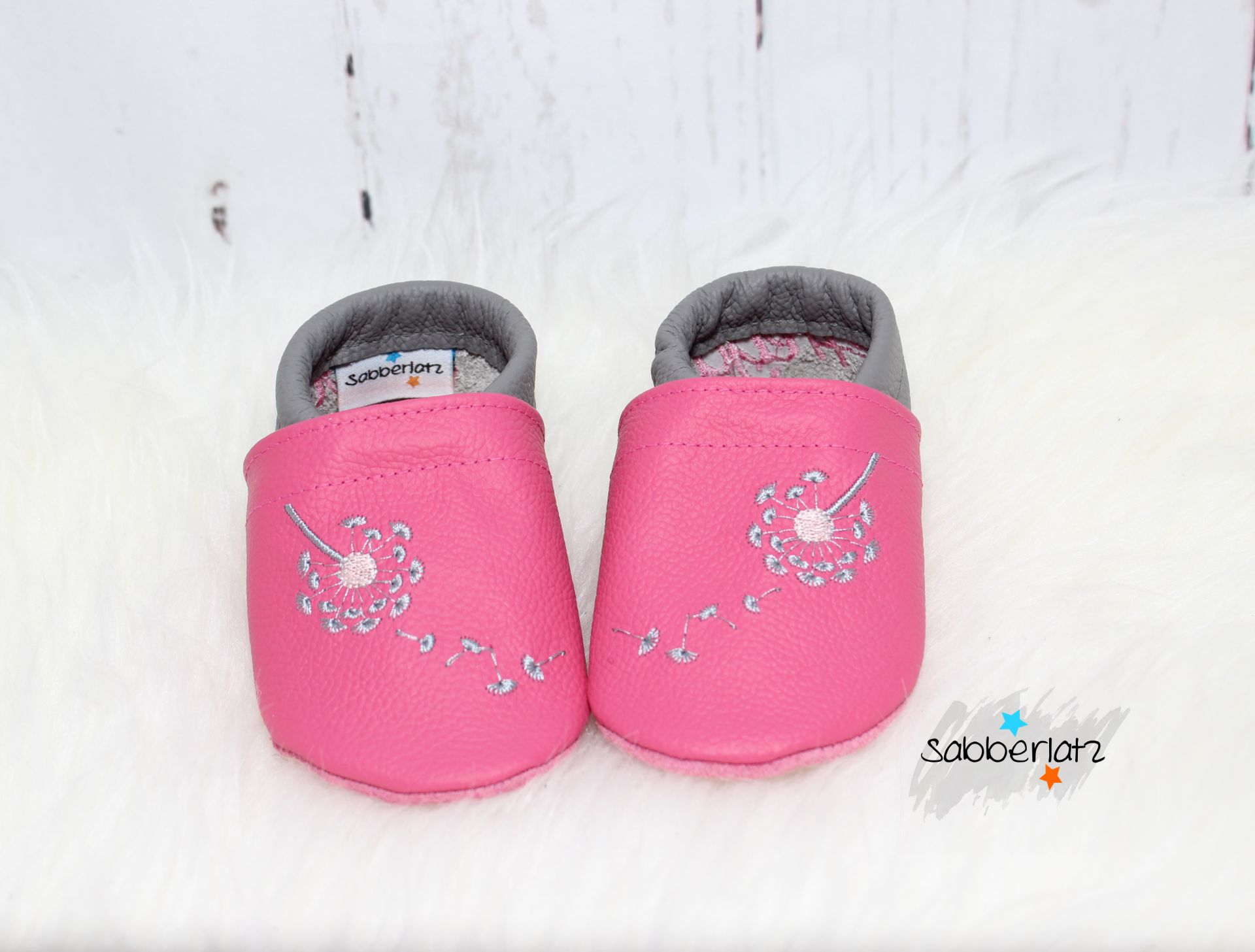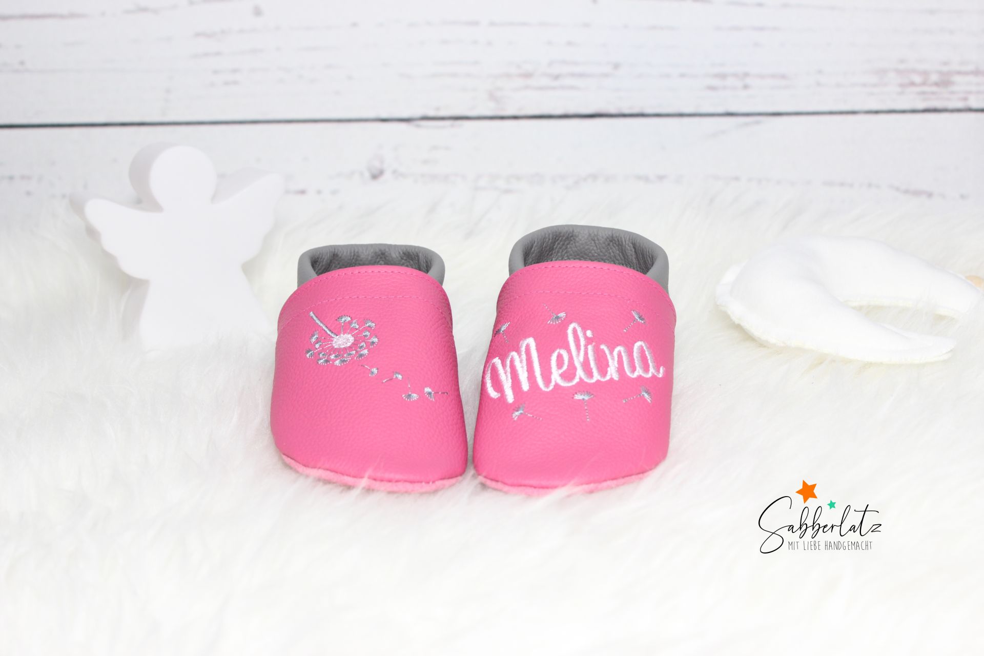 Bitte beachten: Das Gummi in den Puschen lasse ich offen, damit es individuell an den Fuß des Kindes angepasst werden kann. Eine Anleitung zum Verknoten liegt der Bestellung bei.