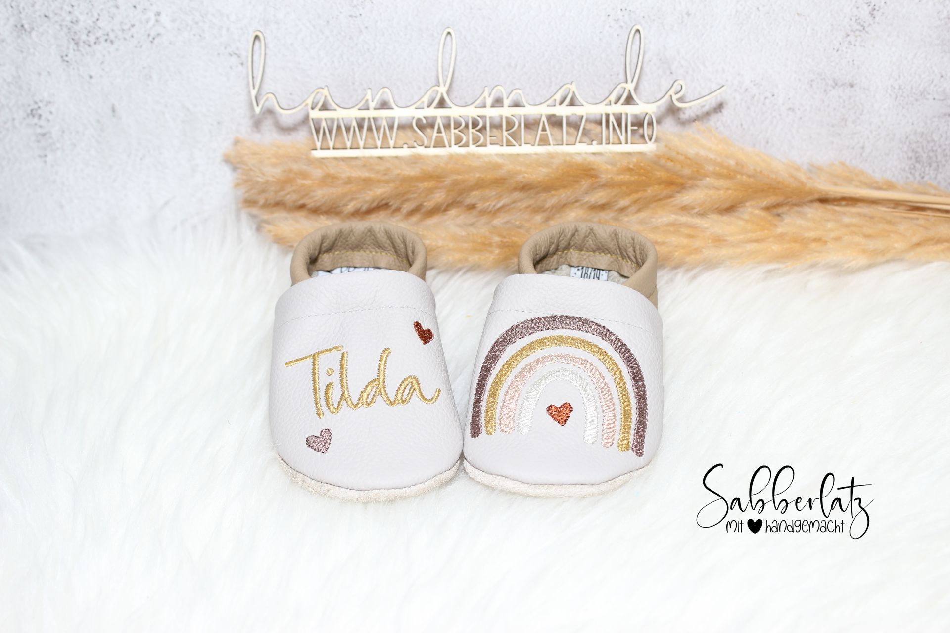 Bitte beachten: Das Gummi in den Puschen lasse ich offen, damit es individuell an den Fuß des Kindes angepasst werden kann. Eine Anleitung zum Verknoten liegt der Bestellung bei.