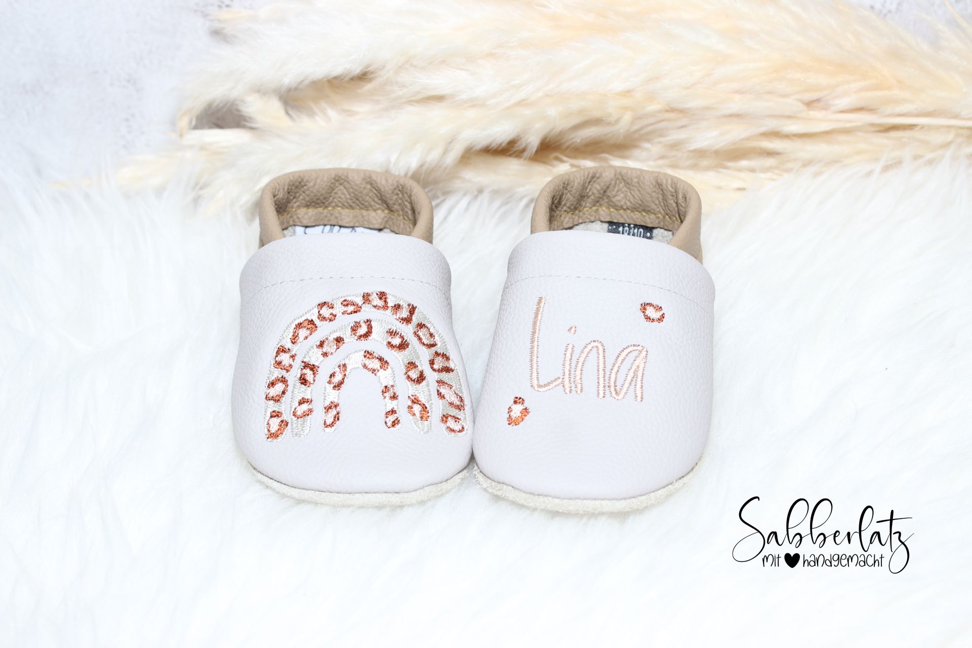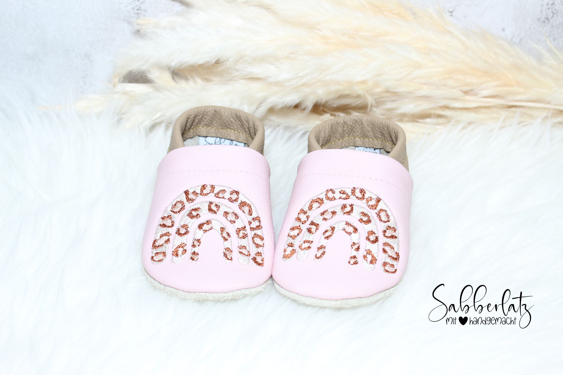 Bitte beachten: Das Gummi in den Puschen lasse ich offen, damit es individuell an den Fuß des Kindes angepasst werden kann. Eine Anleitung zum Verknoten liegt der Bestellung bei.