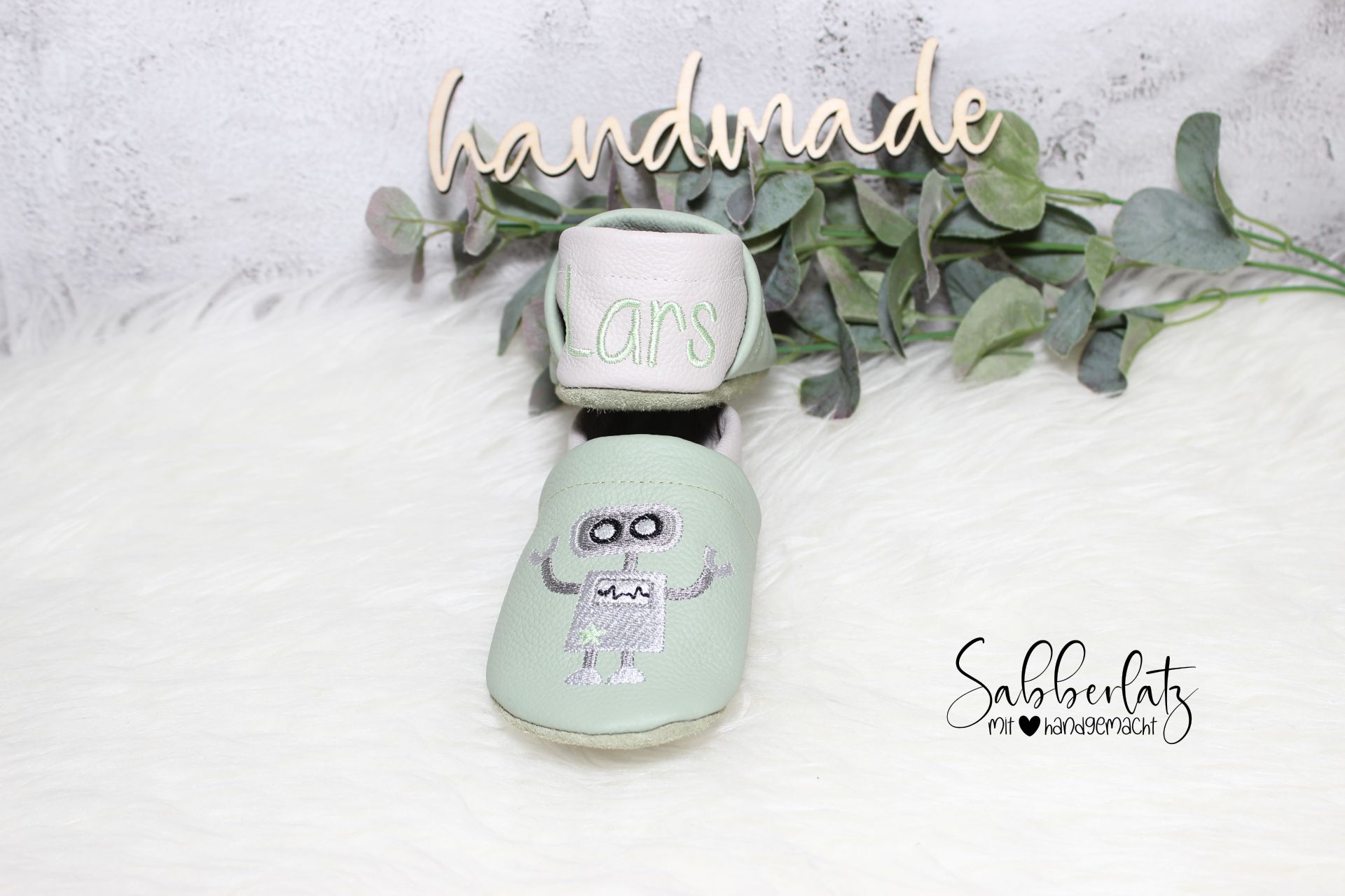 Bitte beachten: Das Gummi in den Puschen lasse ich offen, damit es individuell an den Fuß des Kindes angepasst werden kann. Eine Anleitung zum verknoten liegt der Bestellung bei.