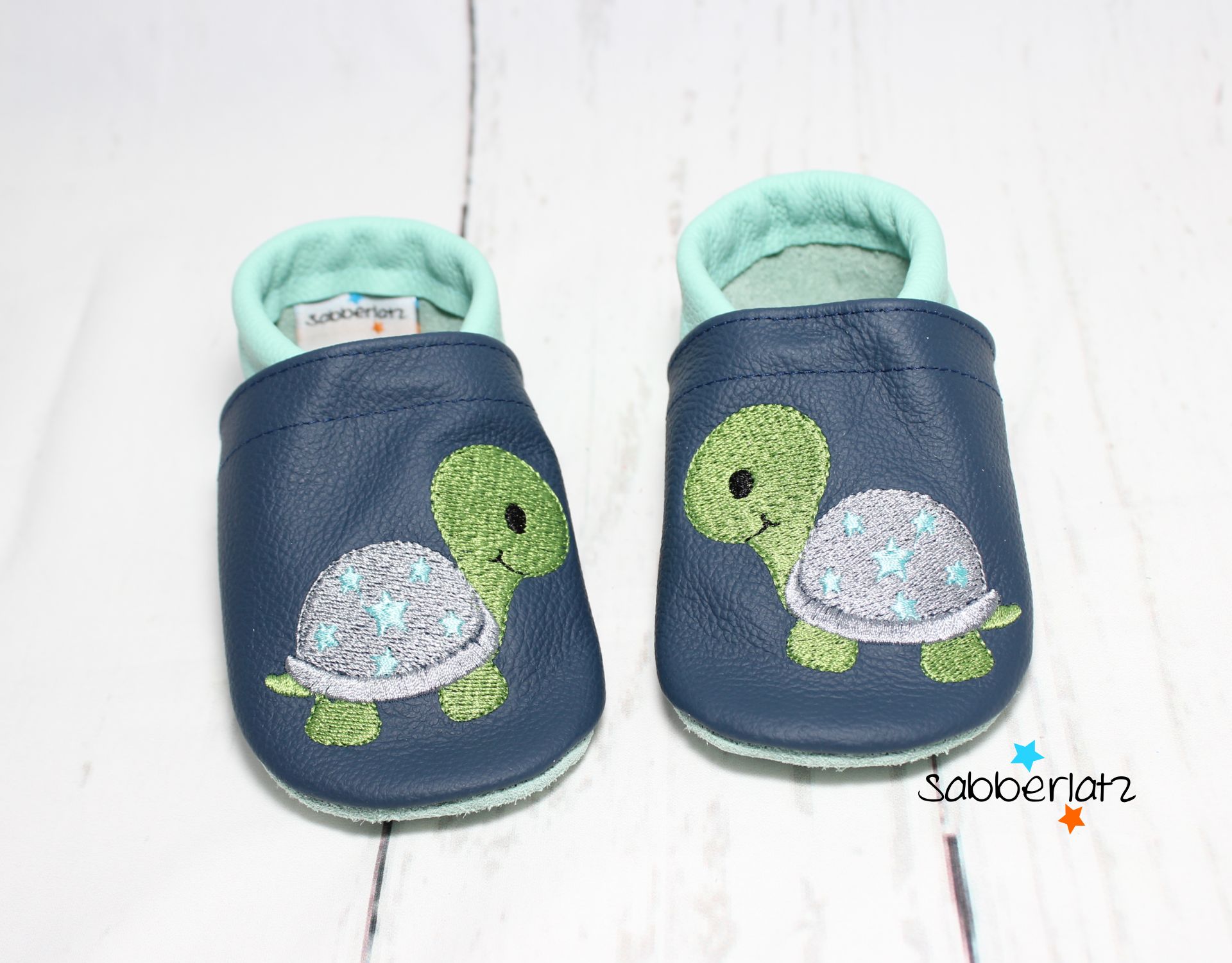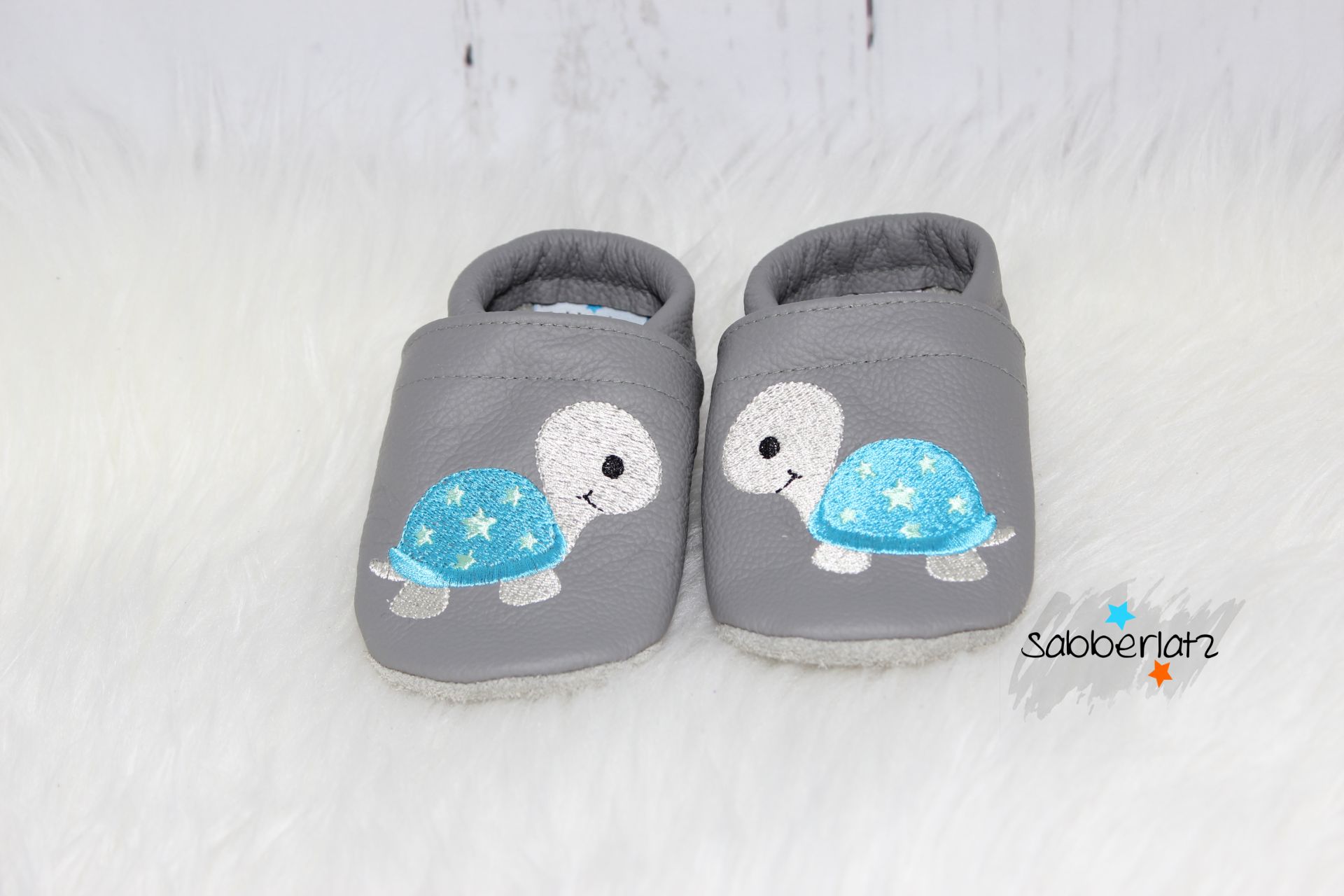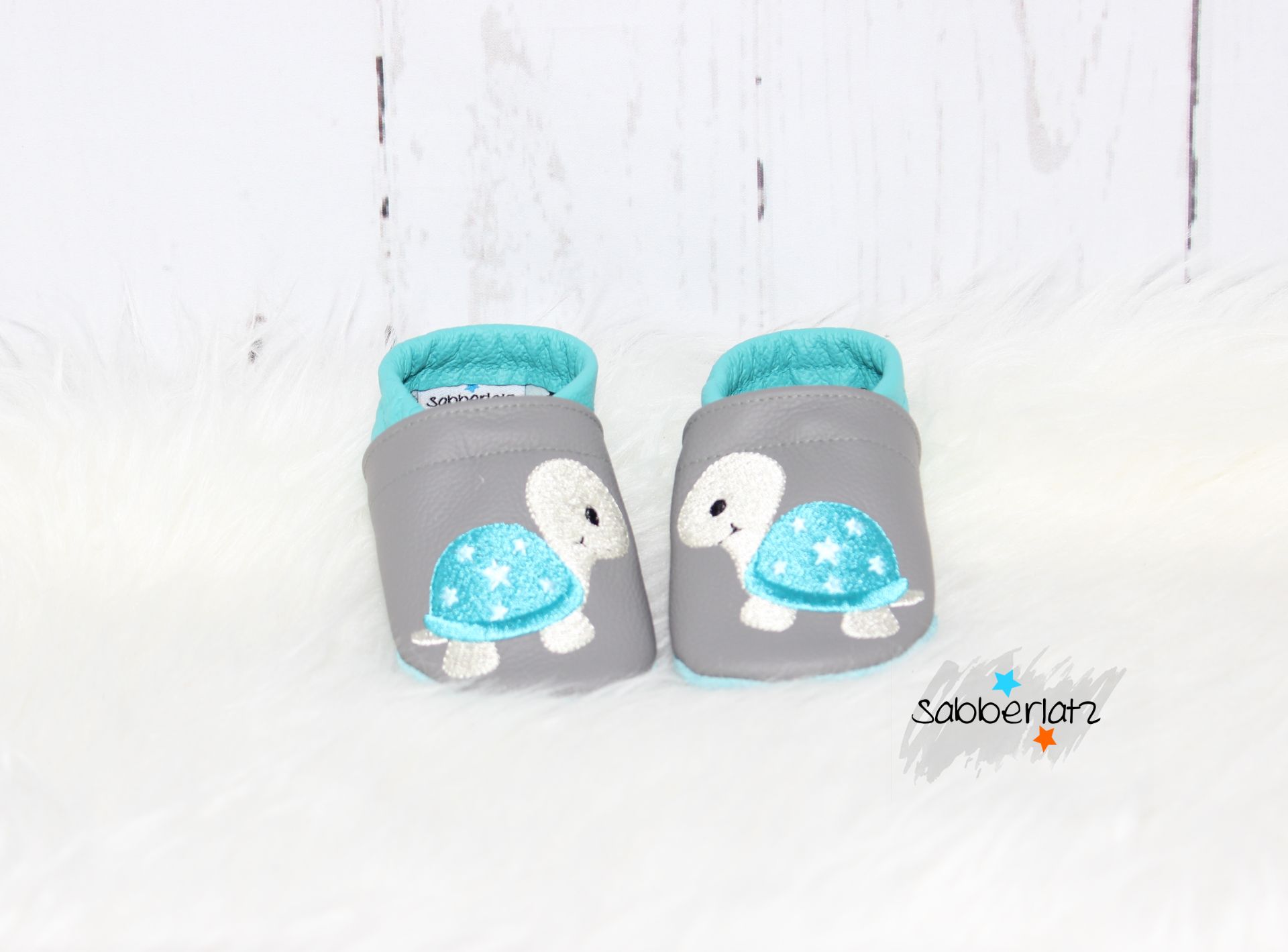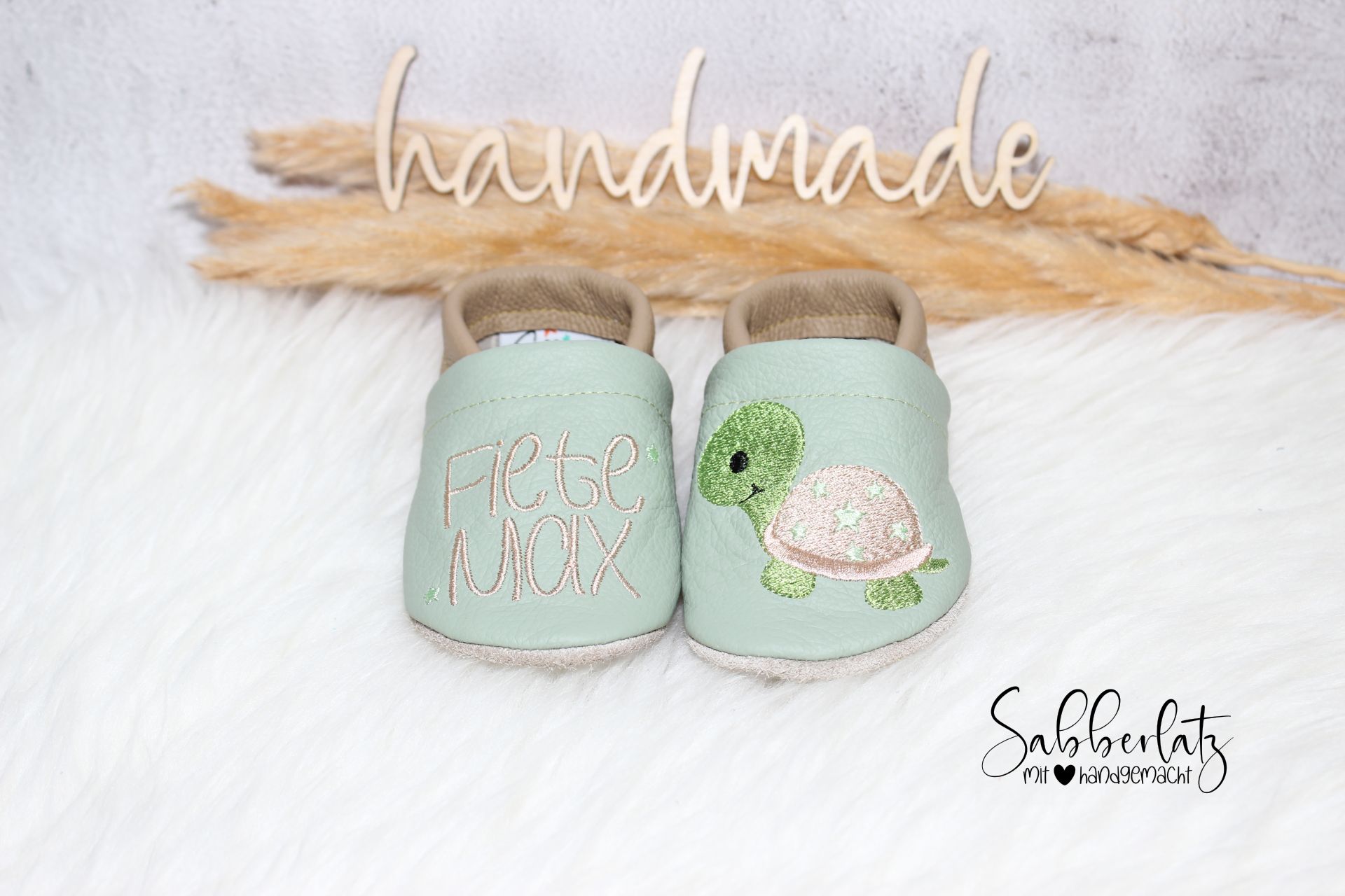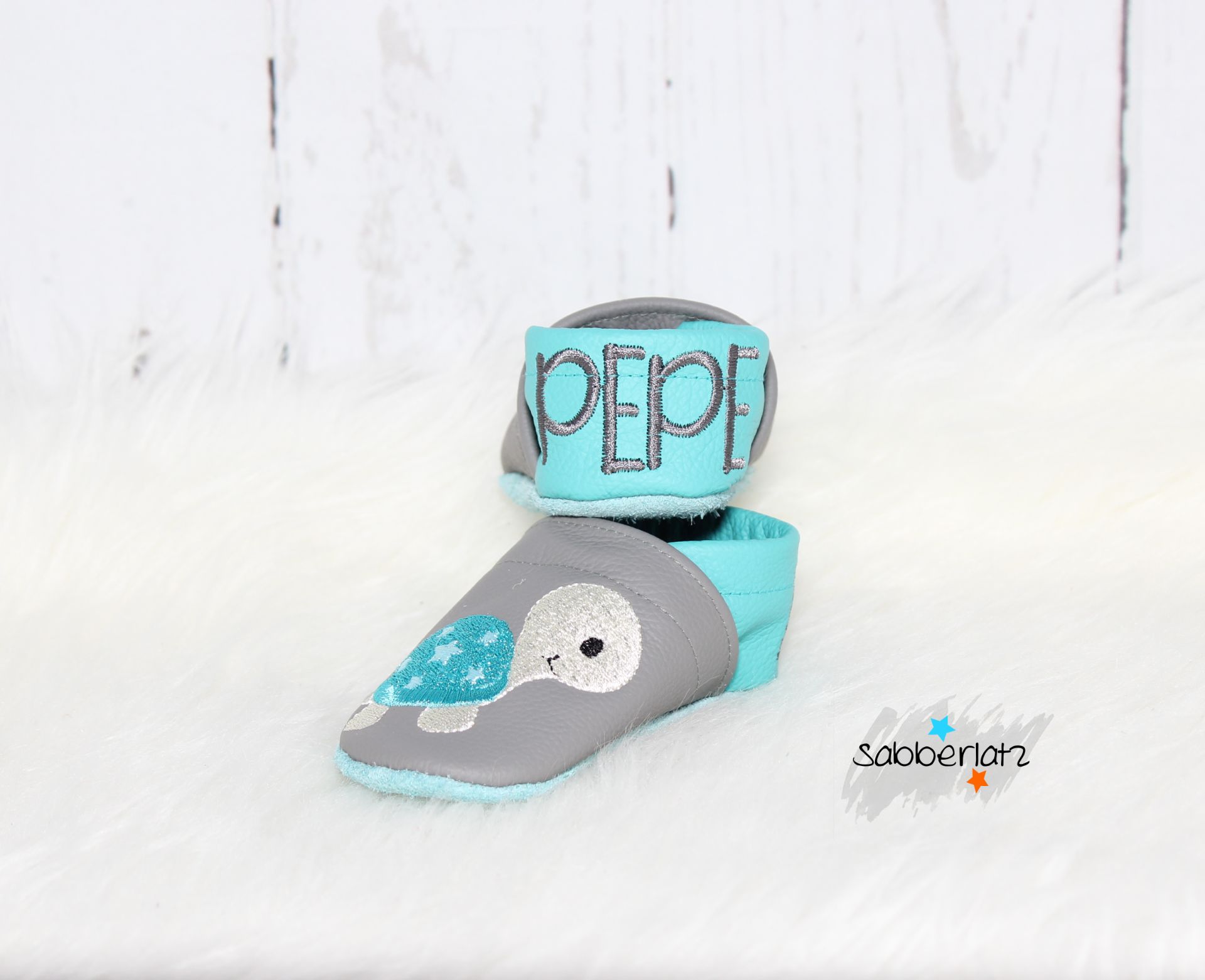 Bitte beachten: Das Gummi in den Puschen lasse ich offen, damit es individuell an den Fuß des Kindes angepasst werden kann. Eine Anleitung zum Verknoten liegt der Bestellung bei.