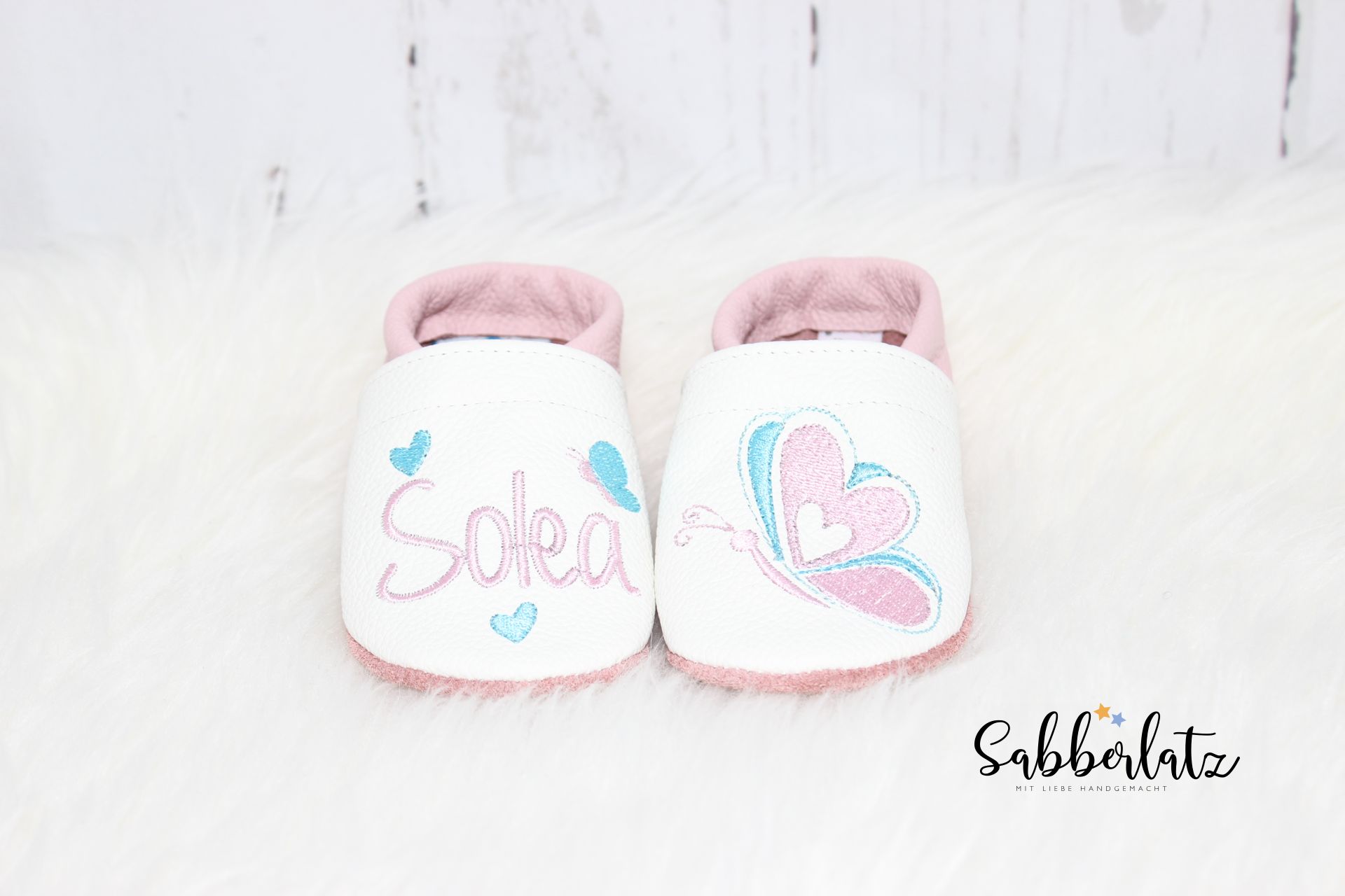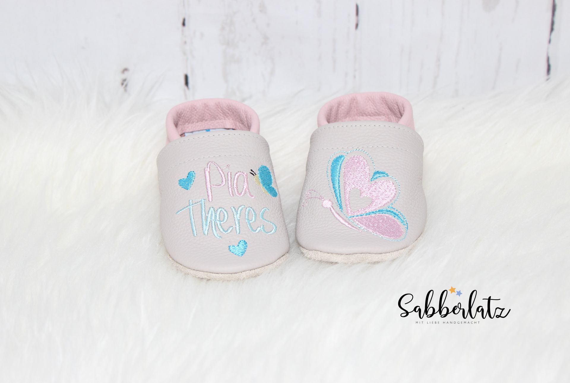 Bitte beachten: Das Gummi in den Puschen lasse ich offen, damit es individuell an den Fuß des Kindes angepasst werden kann. Eine Anleitung zum Verknoten liegt der Bestellung bei.