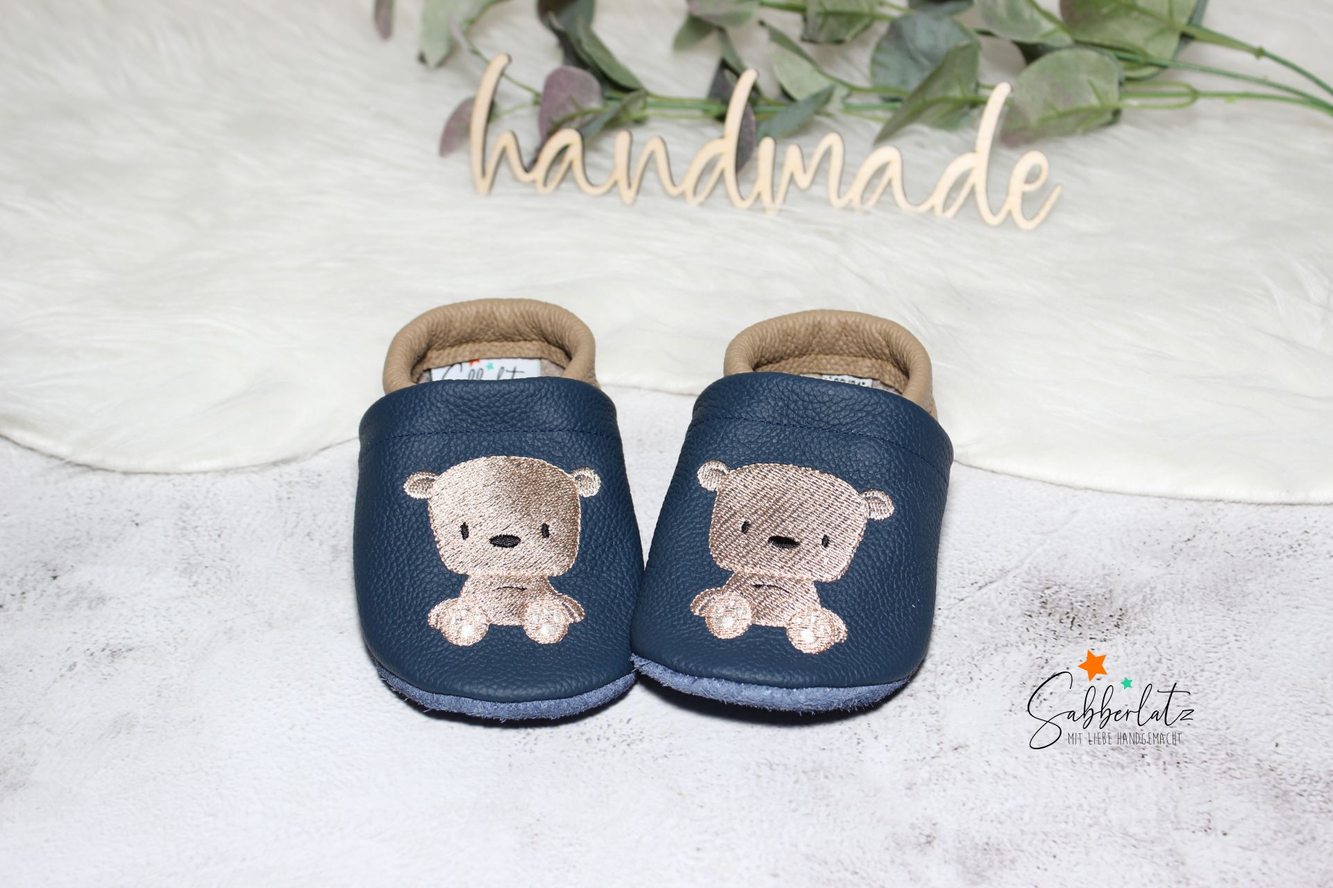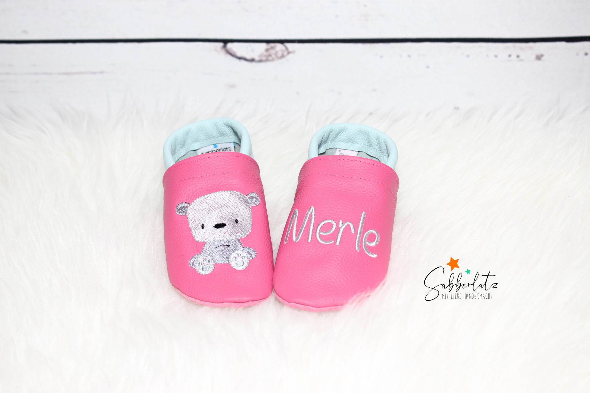 Bitte beachten: Das Gummi in den Puschen lasse ich offen, damit es individuell an den Fuß des Kindes angepasst werden kann. Eine Anleitung zum Verknoten liegt der Bestellung bei.