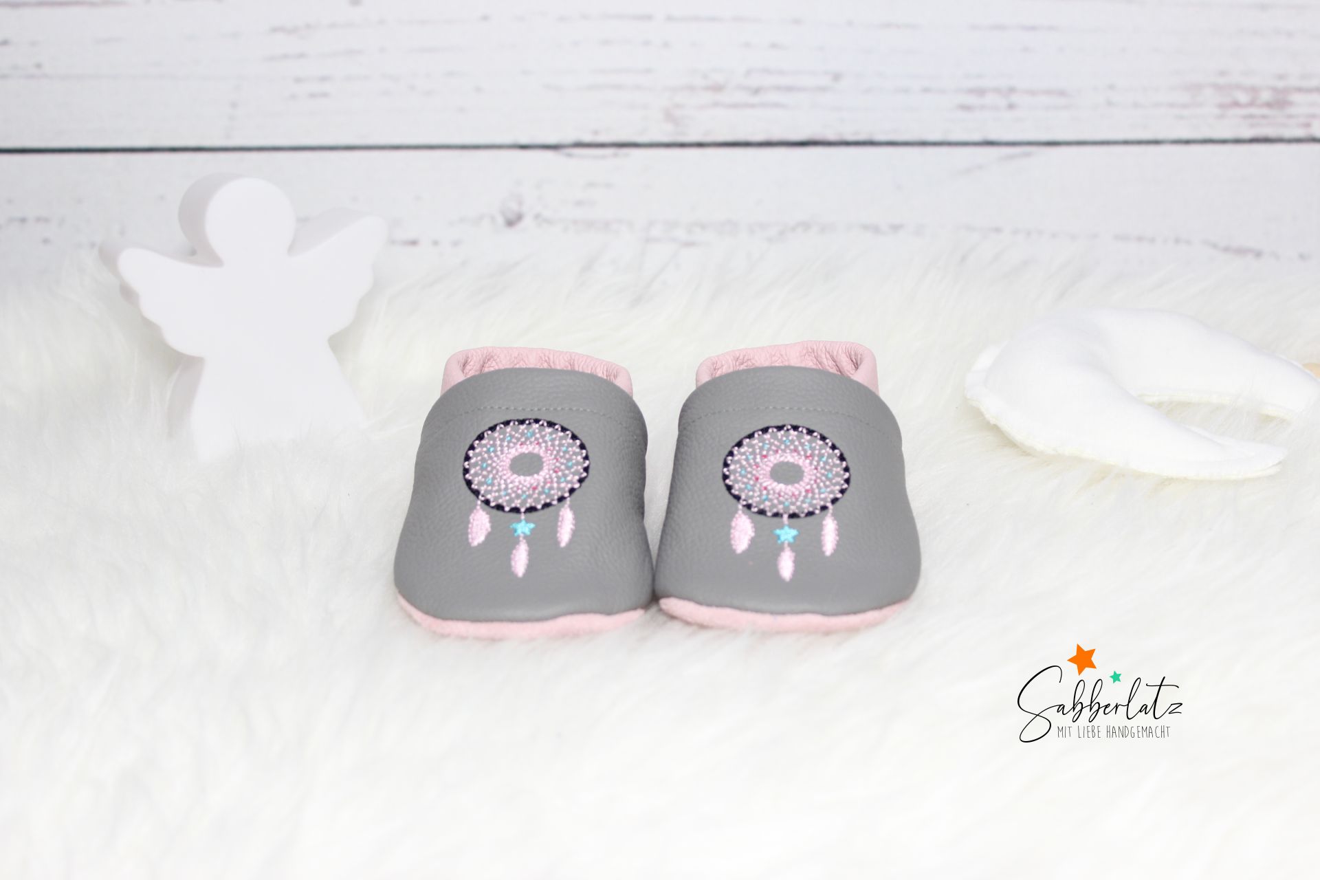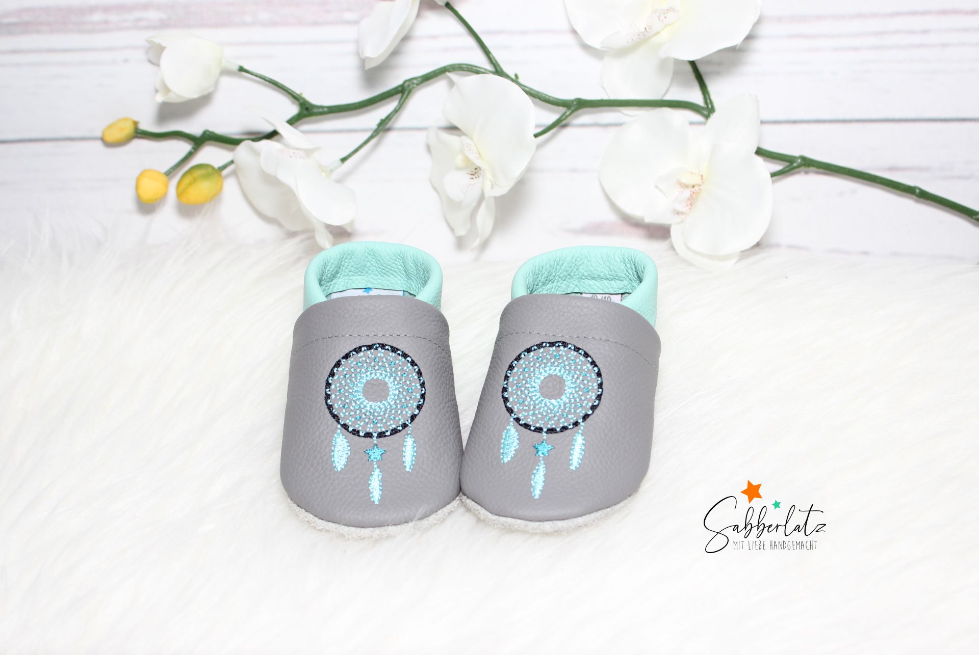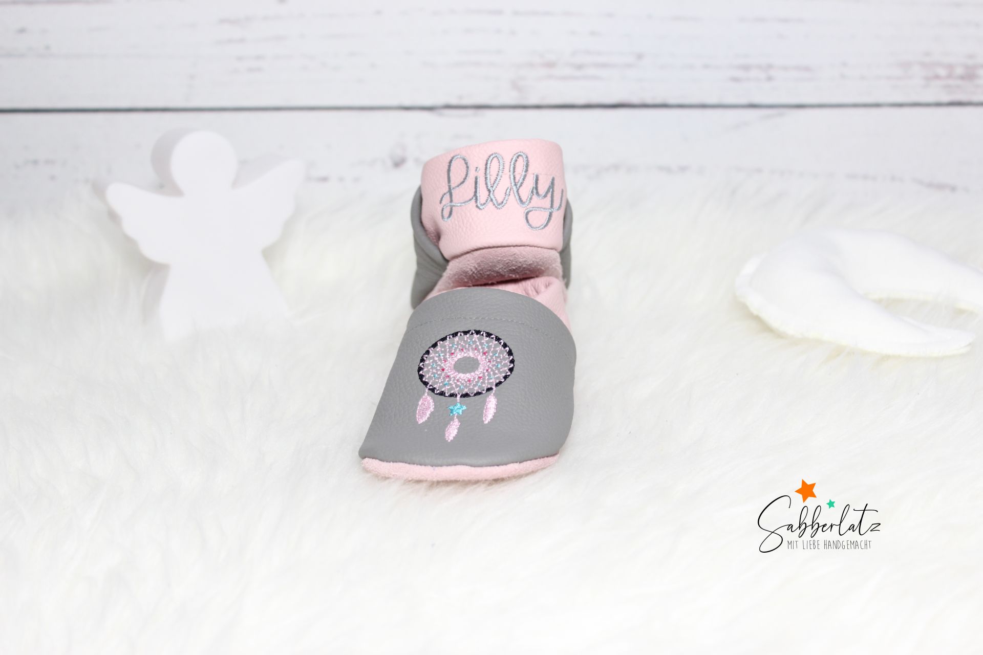 Wenn Name vorne gewählt wird, kommt der Name auf eine Seite des Schuhs mit kleinen Federn und auf die andere Seite der Traumfänger.