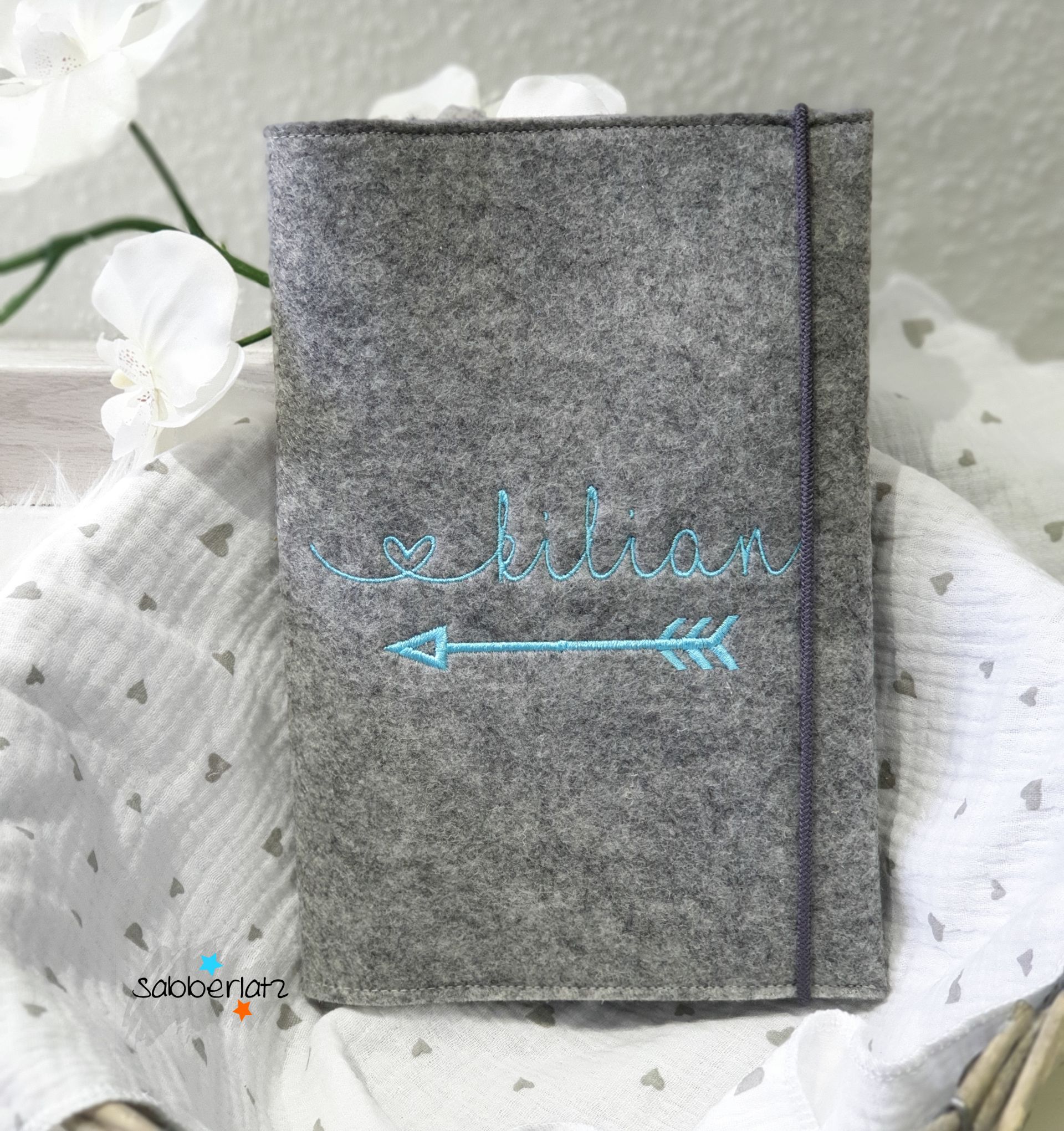 Kilian: Filz Grau, Bestickung Pazifikblau, Gummiband Dunkelgrau