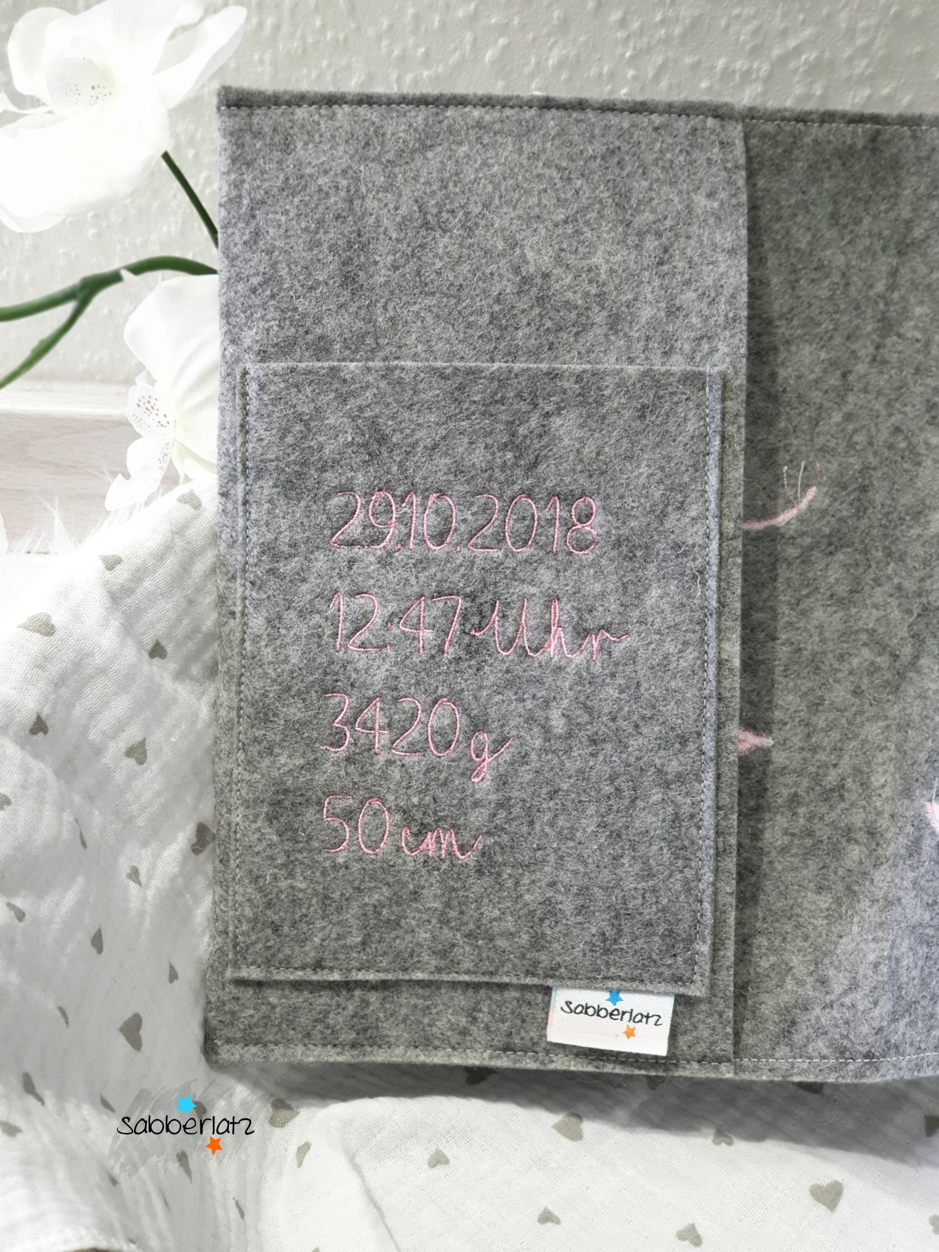 Innenseite auf Wunsch mit Impfpassfach und Bestickung mit Daten (Bitte Datum, Uhrzeit, Größe und Gewicht mit angeben), wenn Du ohne Impfpassfach bestellst werden die Daten auf die Lasche innen gestickt, ansonsten werden sie auf das Impfpassfach gestickt.