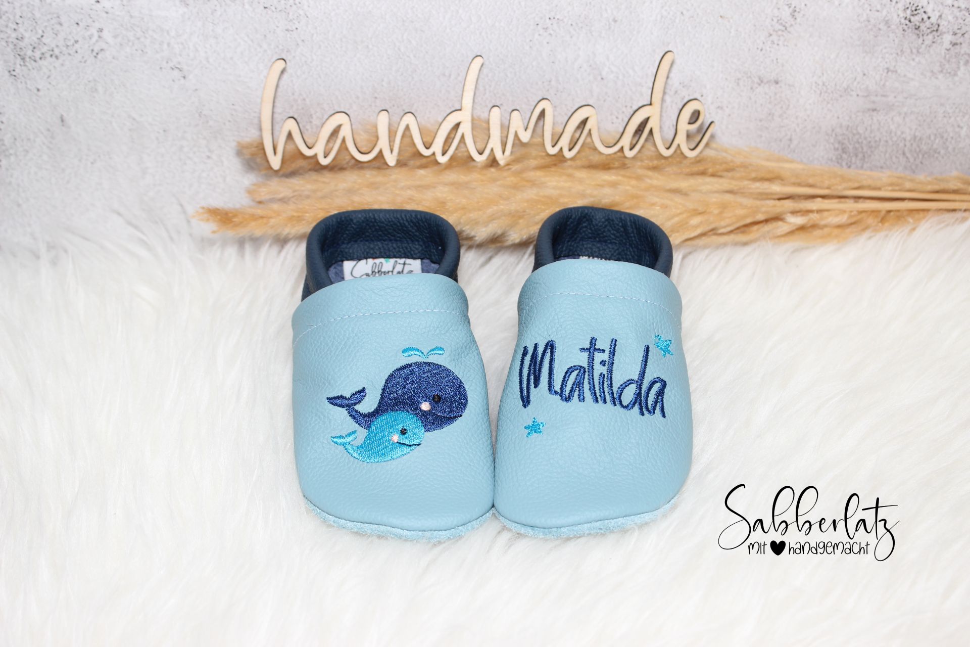 Bitte beachten: Das Gummi in den Puschen lasse ich offen, damit es individuell an den Fuß des Kindes angepasst werden kann. Eine Anleitung zum Verknoten liegt der Bestellung bei.